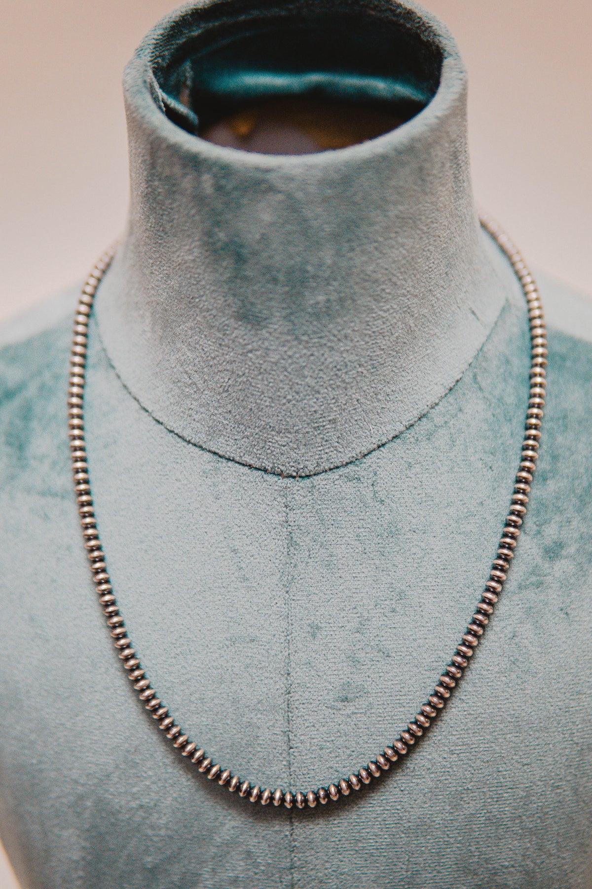 Sleek, sculpted, and stacked with style This 20" strand showcases 4.5MM saucer-shaped Navajo pearls handcrafted in oxidized sterling silver. The saucer design gives a modern edge to a Western classic—ideal for layering or wearing as a solo statement.