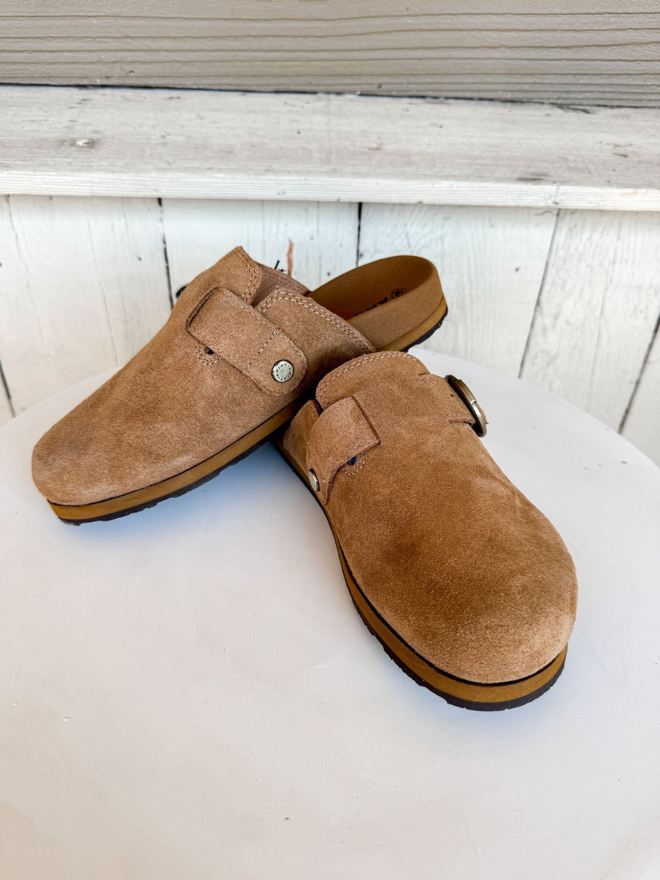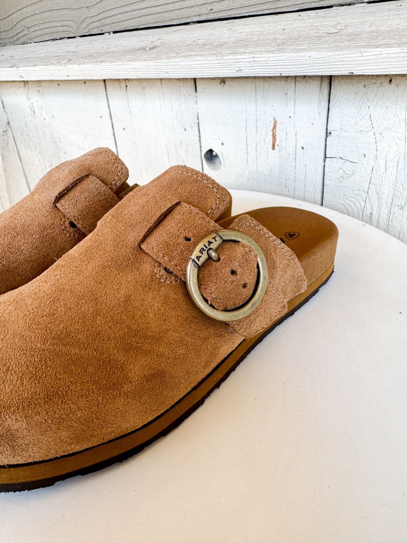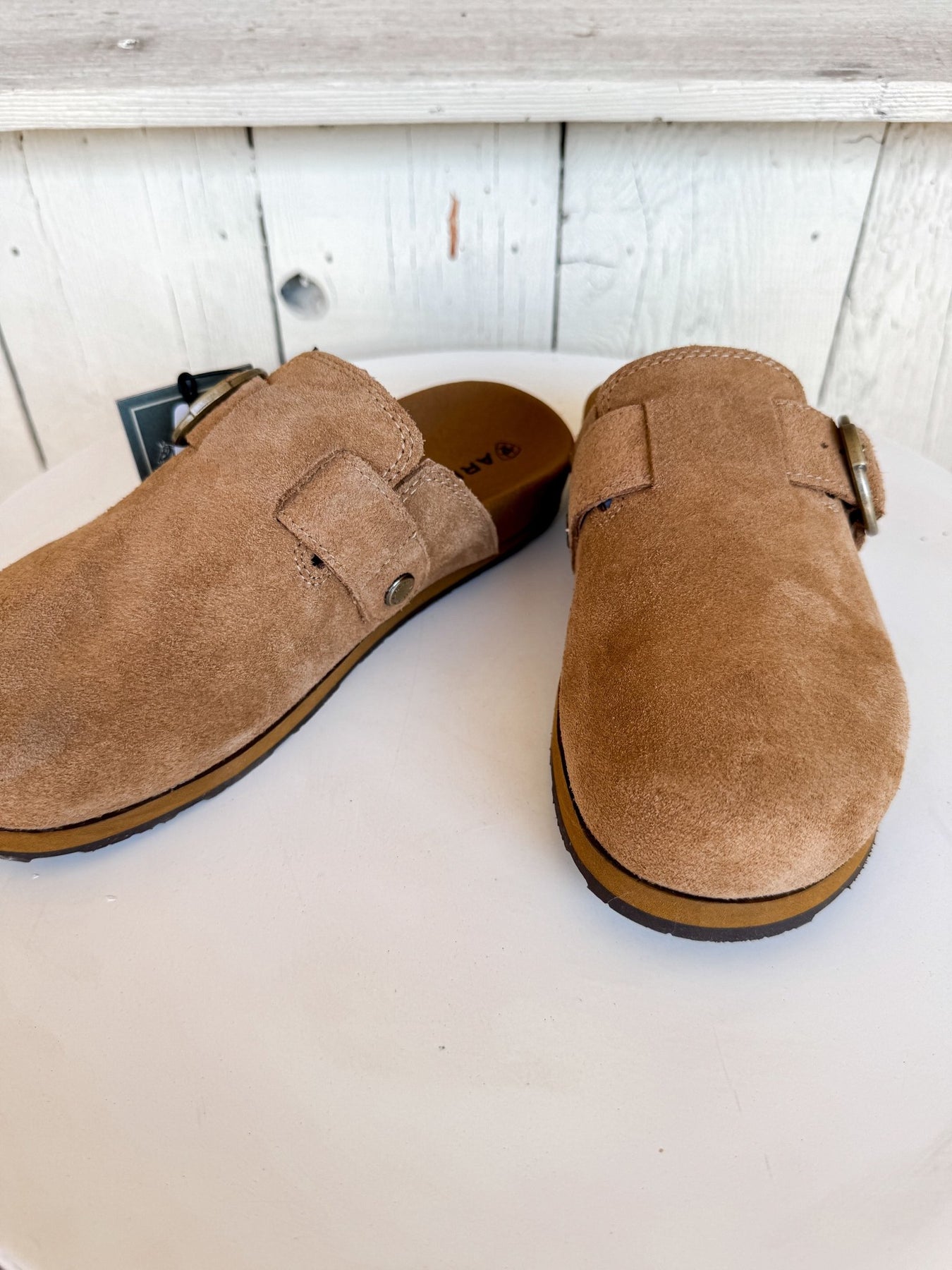 A versatile slip-on mule designed for women who want comfort without sacrificing style. With an equestrian-inspired buckle and rich caramel suede, this mule transitions easily from casual days to polished nights.