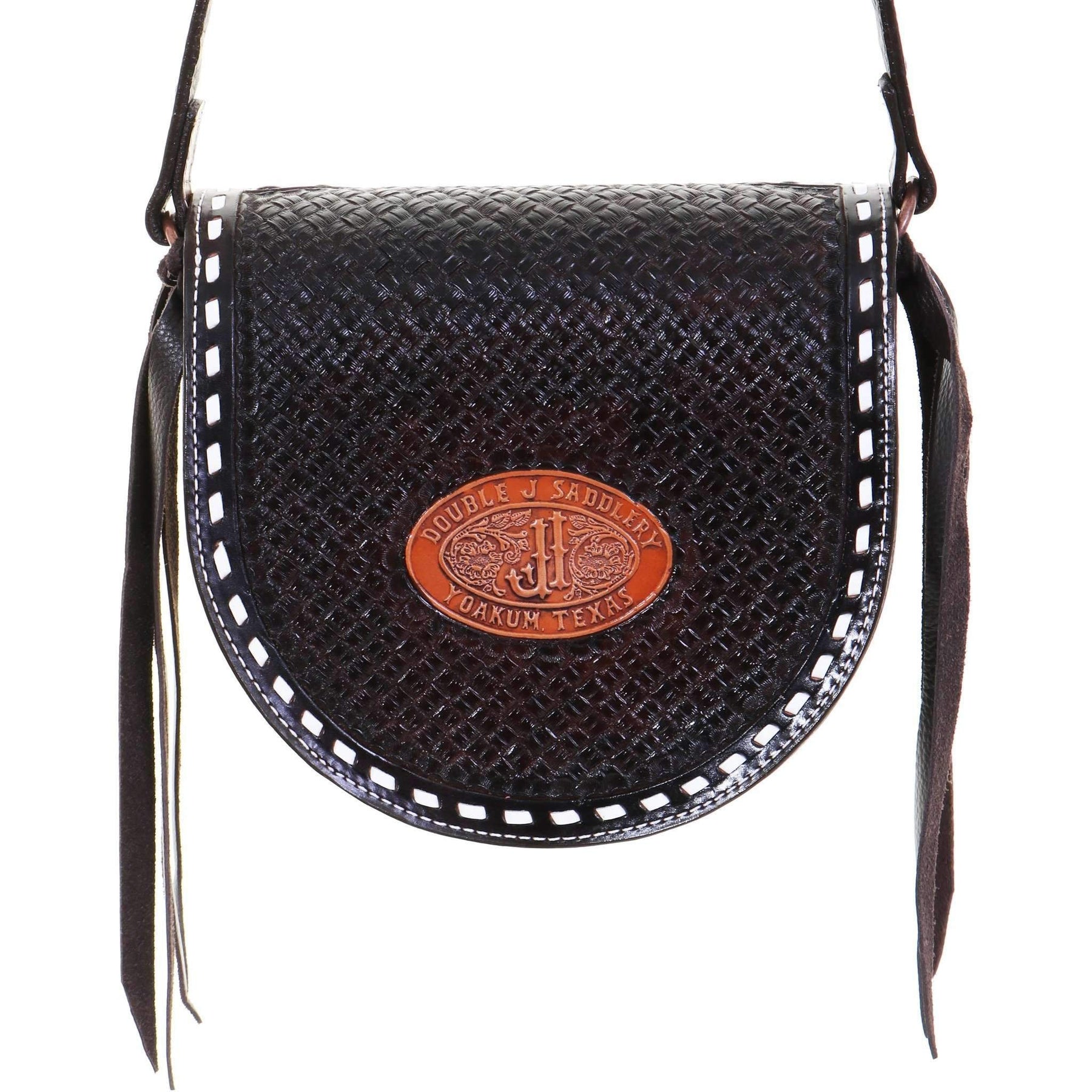 Rooted in tradition, styled for today. This saddle bag blends timeless Western craftsmanship with modern functionality. Made from rich brown leather, it features a box basket weave pattern, natural floral tooling, and striking white buck stitch details. A chocolate chap gusset and saddle strings add authentic character, while the adjustable tooled strap with a Double J buckle makes it easy to wear crossbody or on the shoulder.