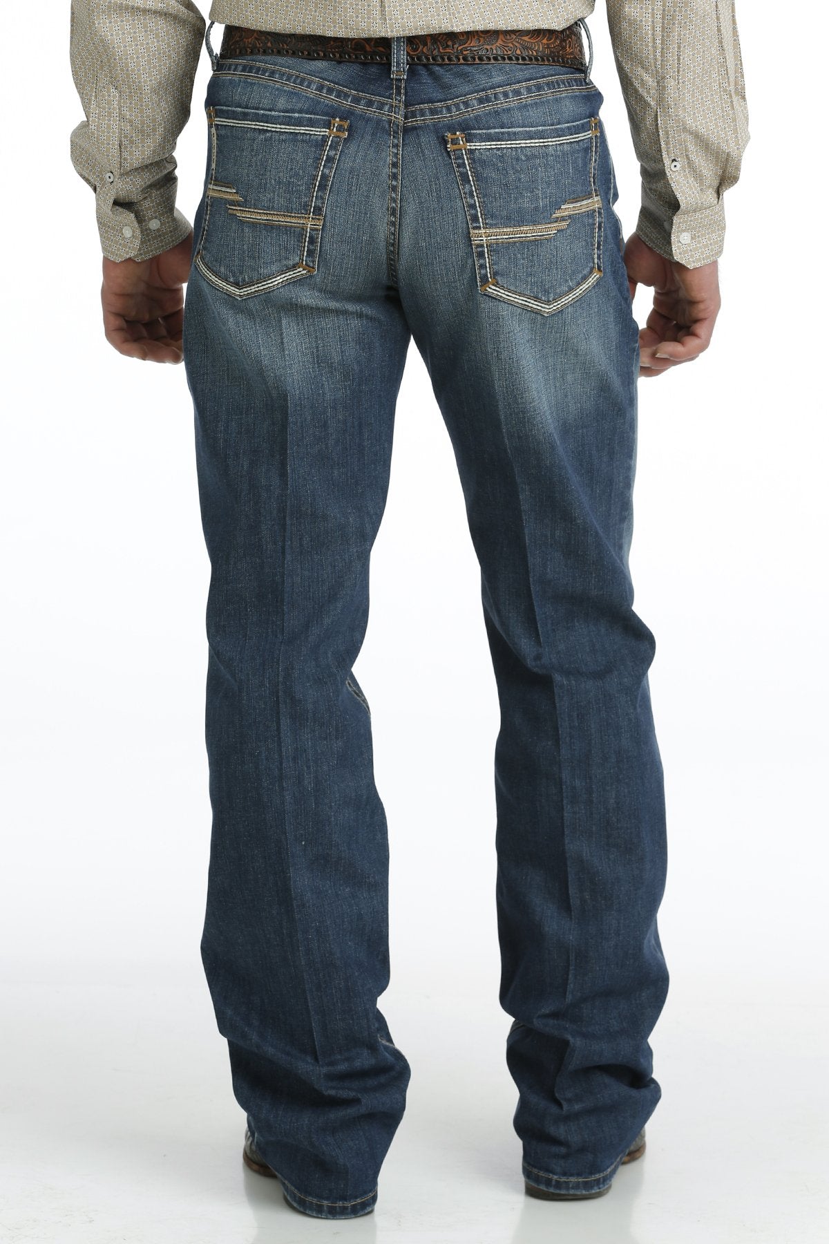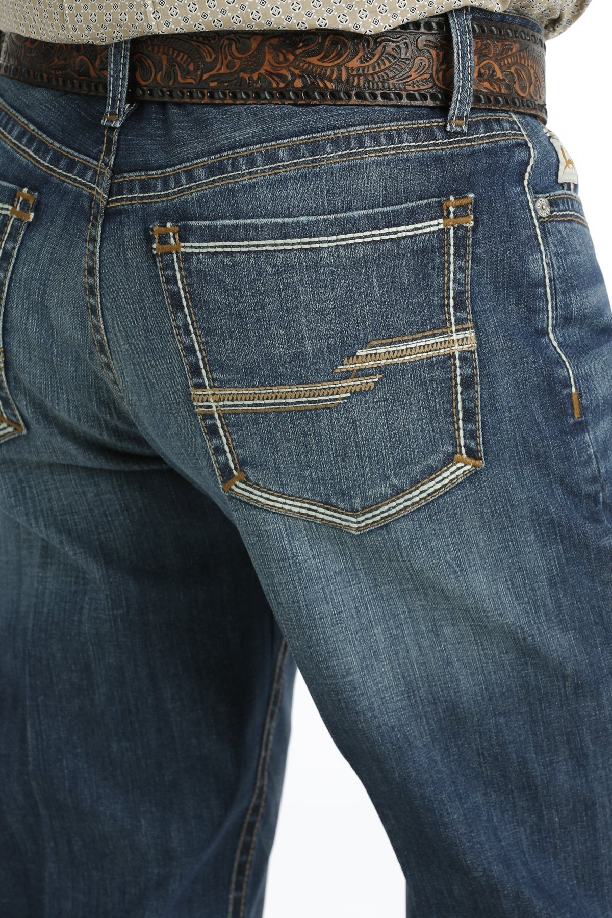 Creating a classic combination on this relaxed fit GRANT is a warm blend of khaki and brown embroidery, and a popular dark stonewash finish accented with sanding, whiskers, chevrons and grinding.