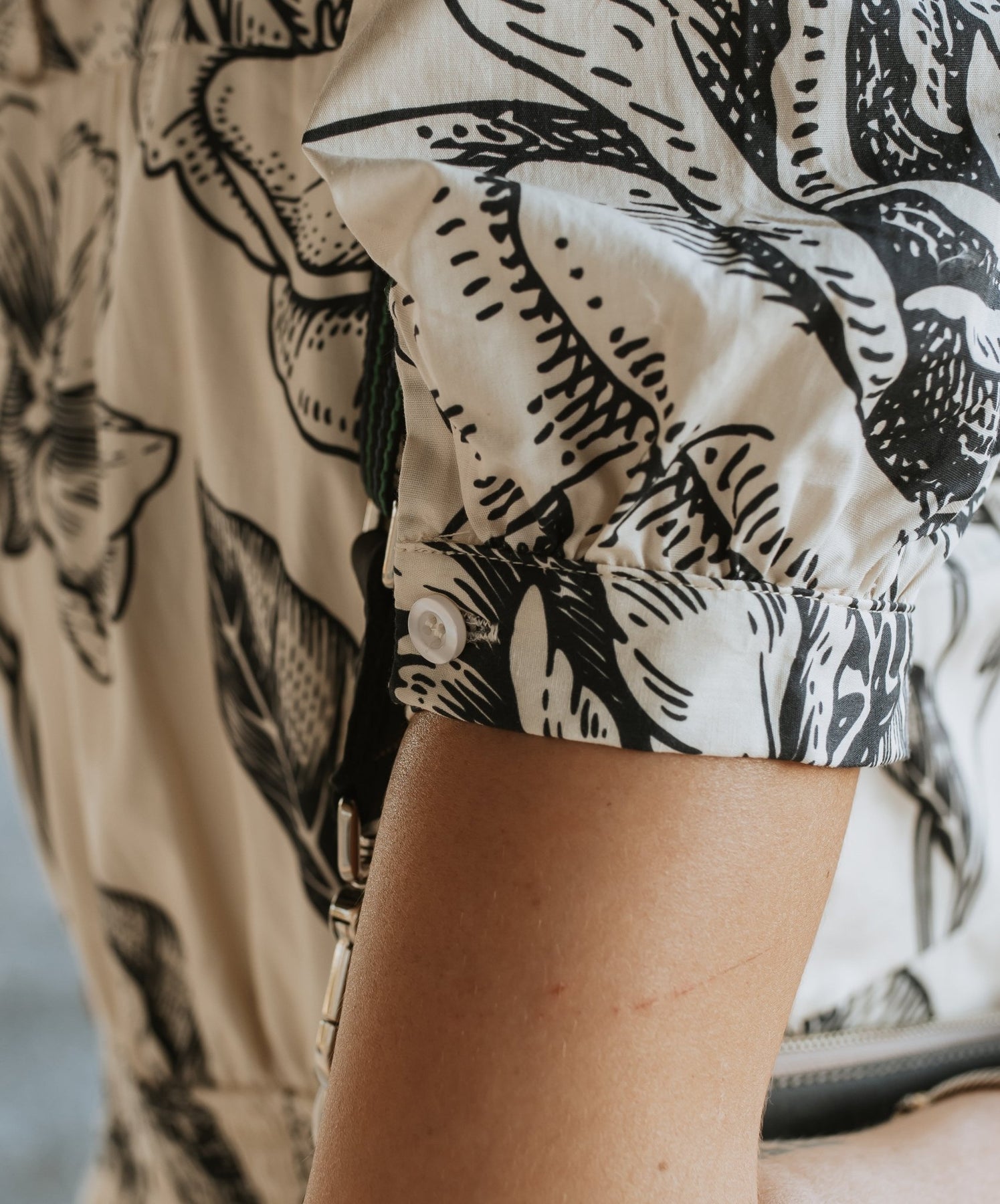 Color: Cream with navy floral print