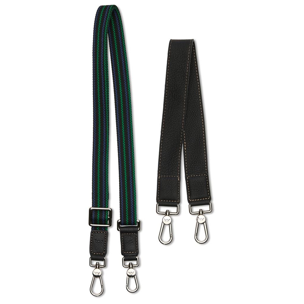 Includes two versatile straps: a studded black leather strap + adjustable woven crossbody strap