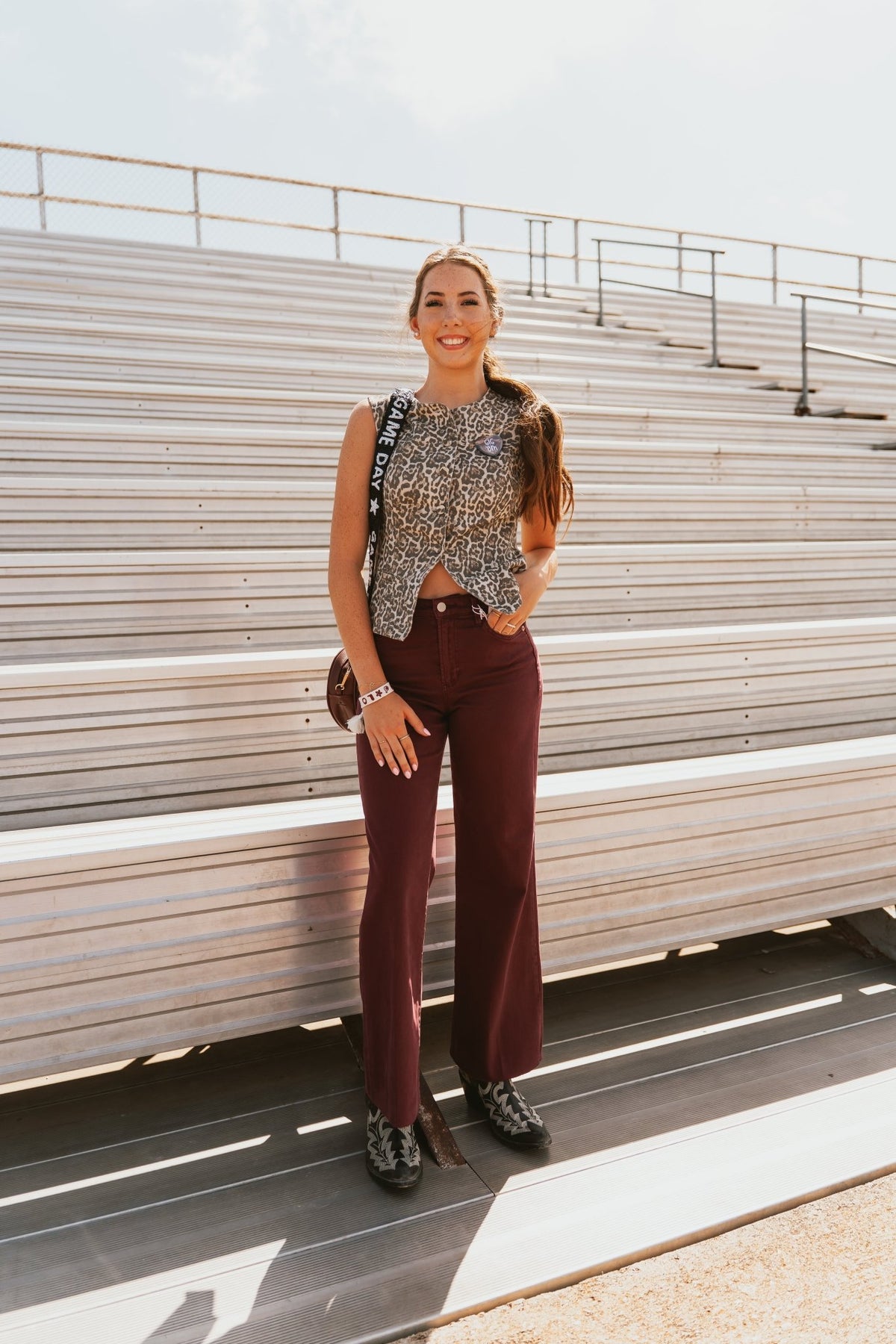 Styling Tip: Pair with a leopard-print sleeveless top and cowboy boots for a standout gameday look 🐆🏈
