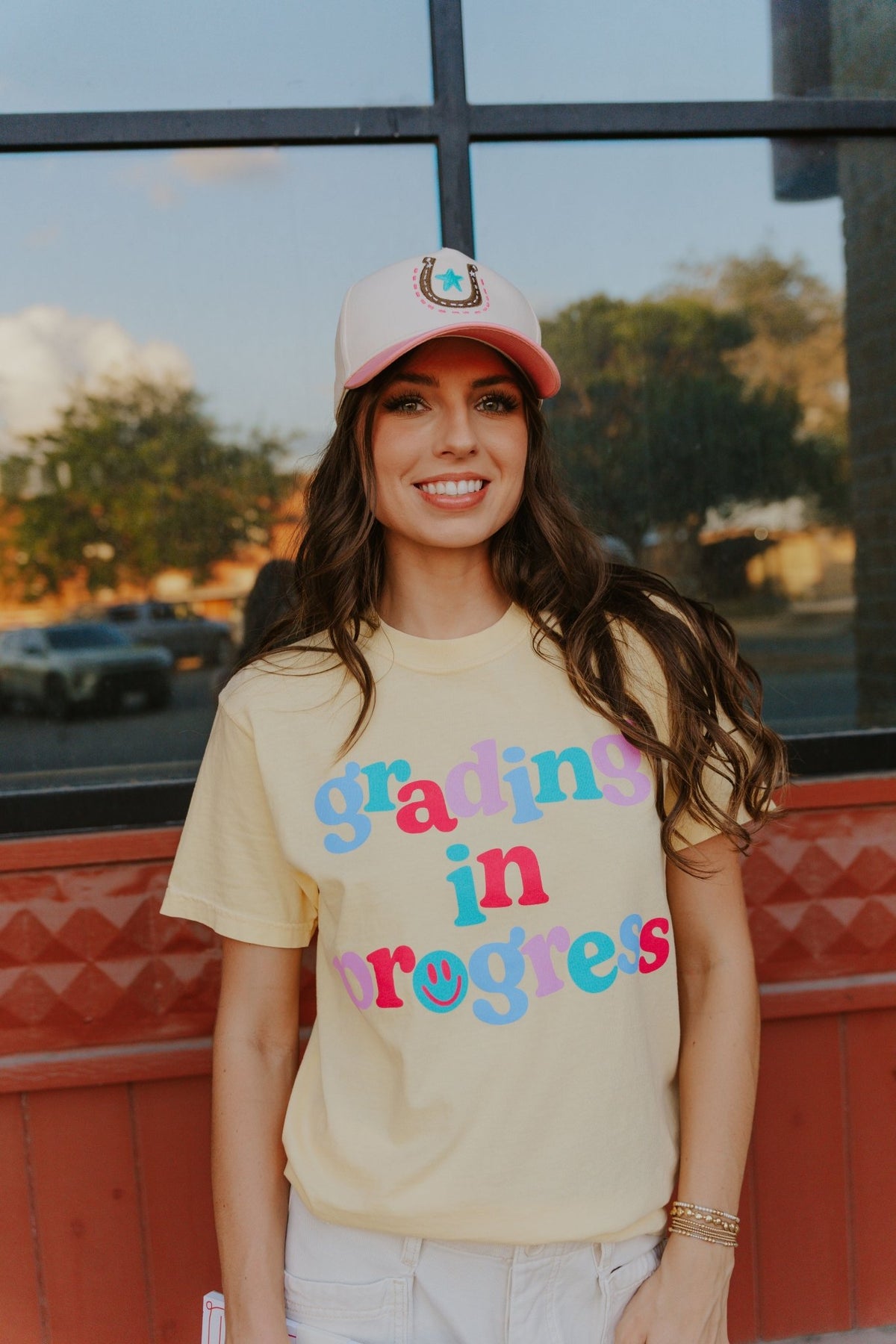 Fun, colorful “Grading in Progress” design with a smiley detail