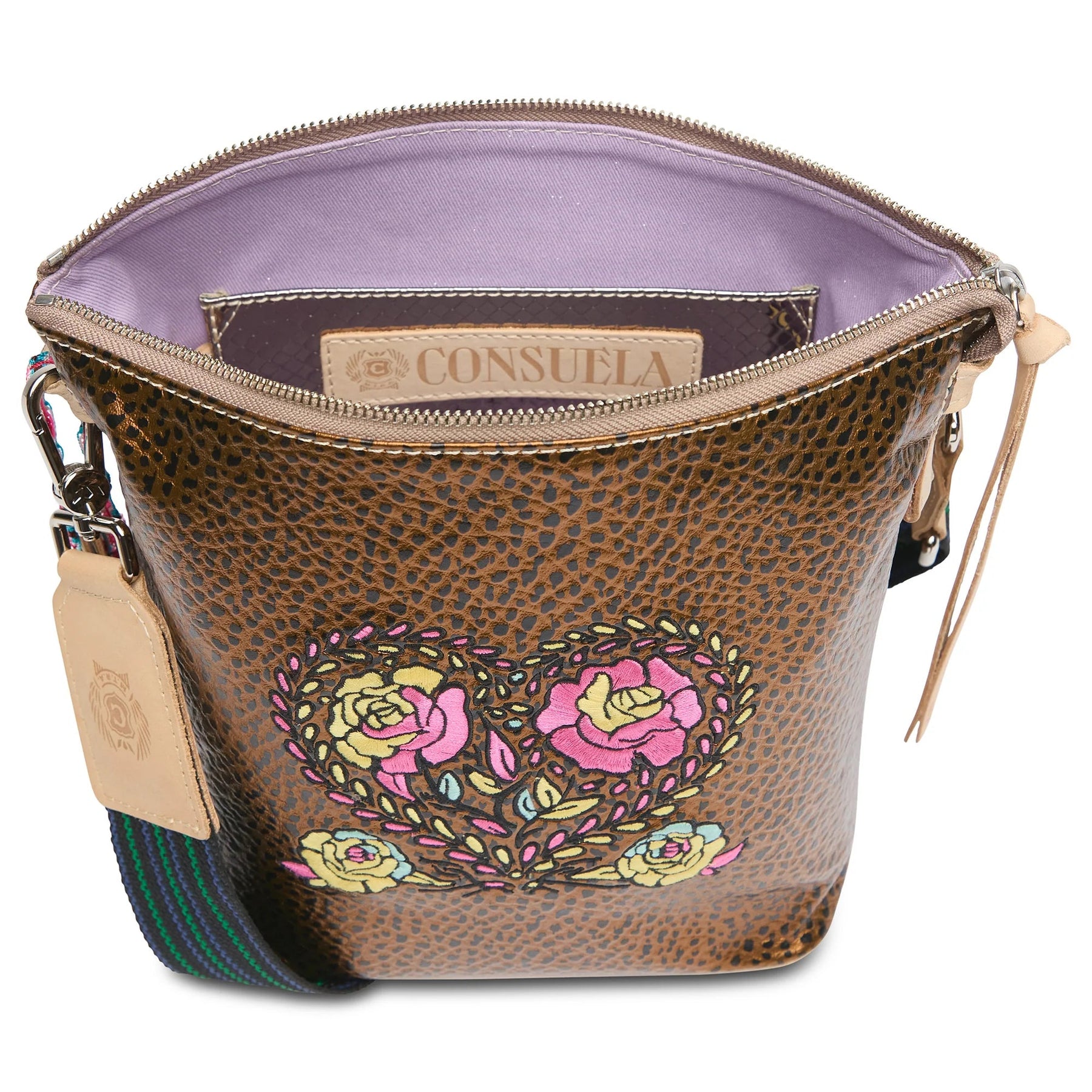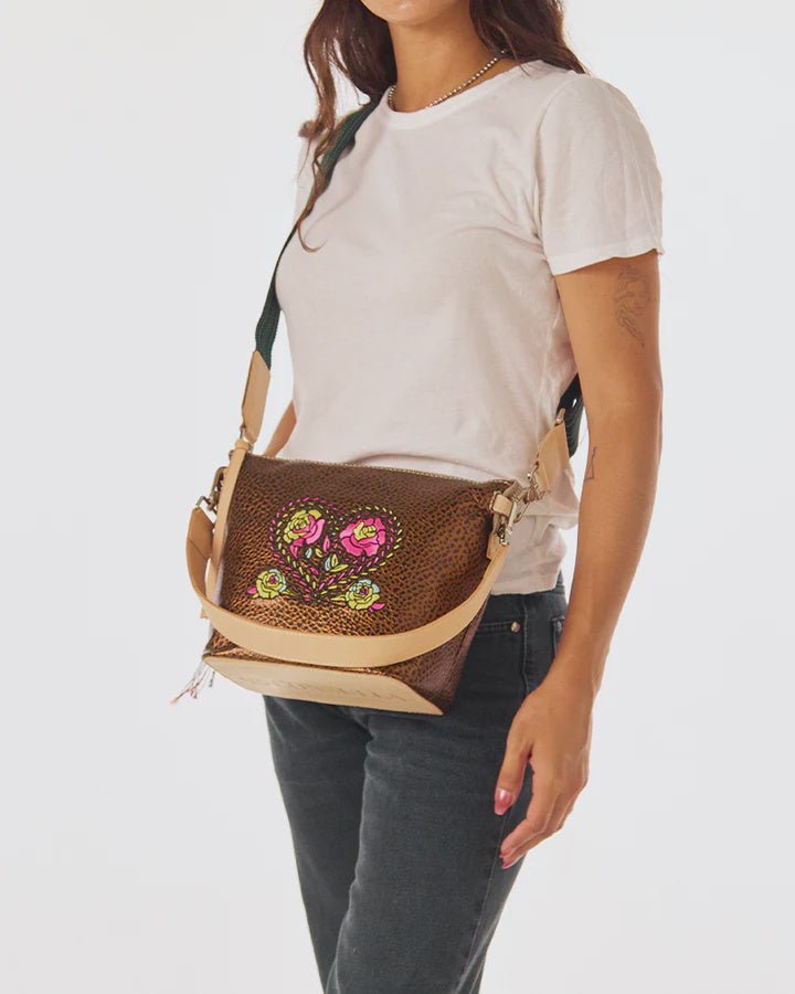 • 7 ¾” (W at the base), 11” (W at the top) x 9” (H) x 5 ½” (D), 8" handle drop or 12 ¼”-23” adjustable crossbody strap drop