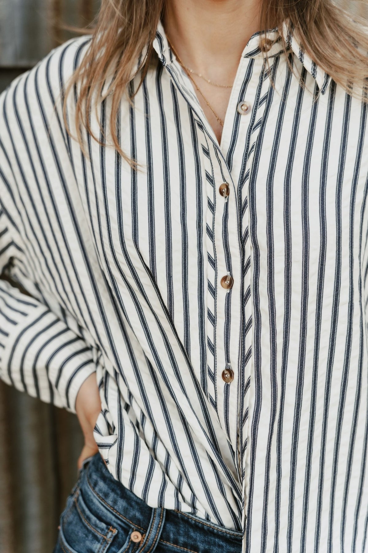 A timeless stripe in an easy oversized silhouette—this button down is a versatile piece you’ll wear on repeat. Lightweight and relaxed, it works just as well tucked into denim as it does layered open over a tank.