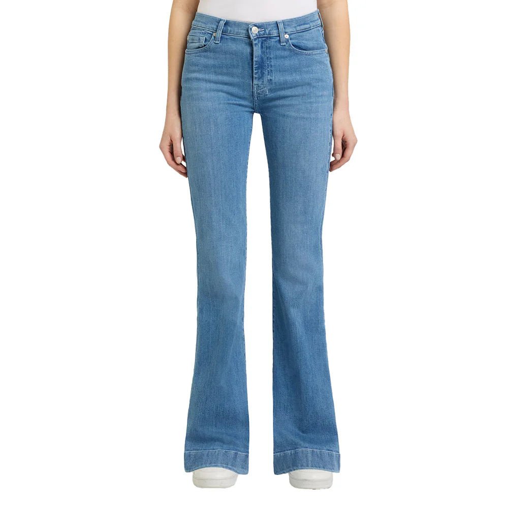 Elevate your silhouette with the iconic 7 For All Mankind Dojo flare jeans in a refreshing Iceflow wash. Featuring a leg-lengthening 34" inseam and signature teal back-pocket embroidery, these mid-rise flares offer the perfect blend of premium stretch comfort and timeless designer style.