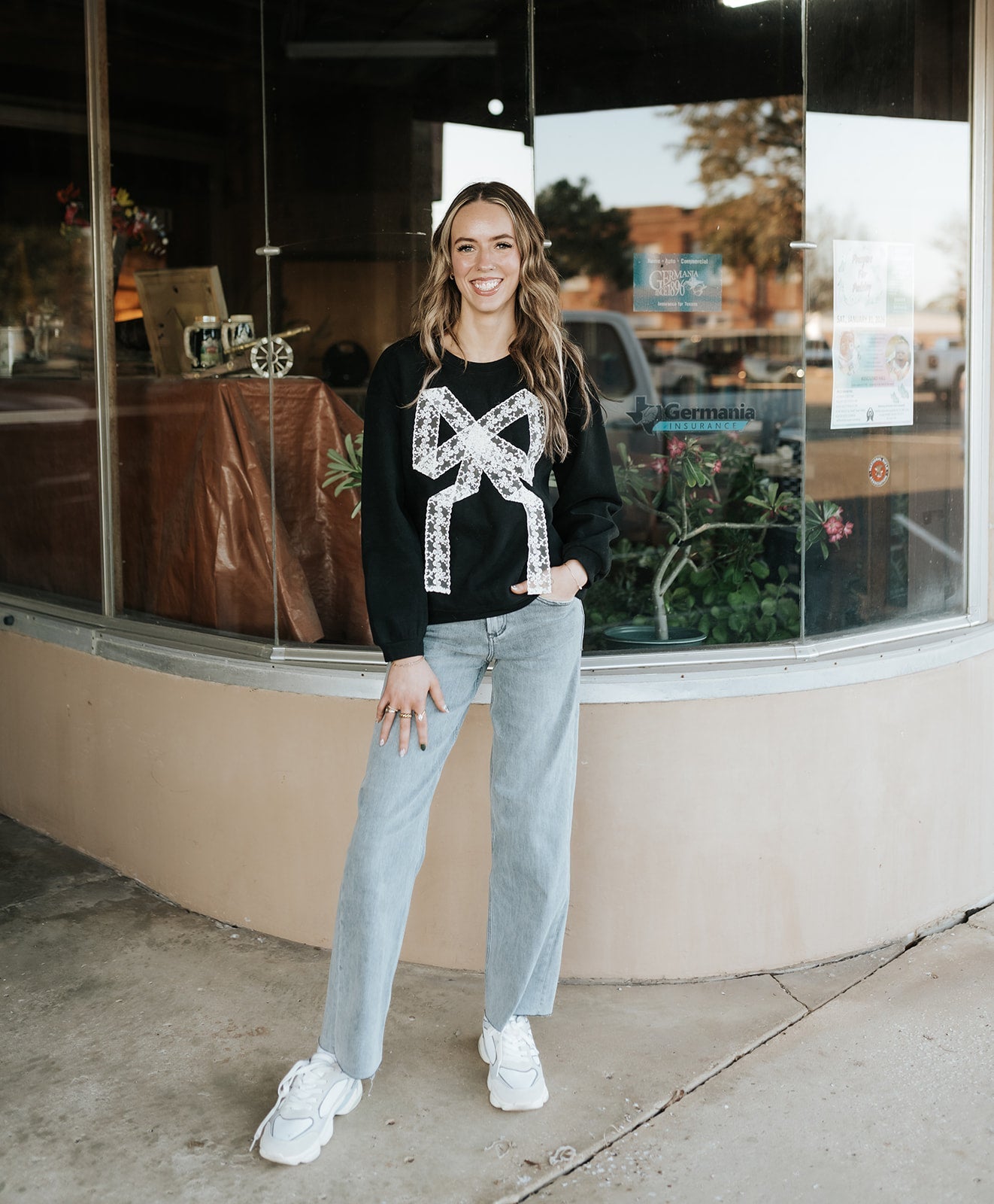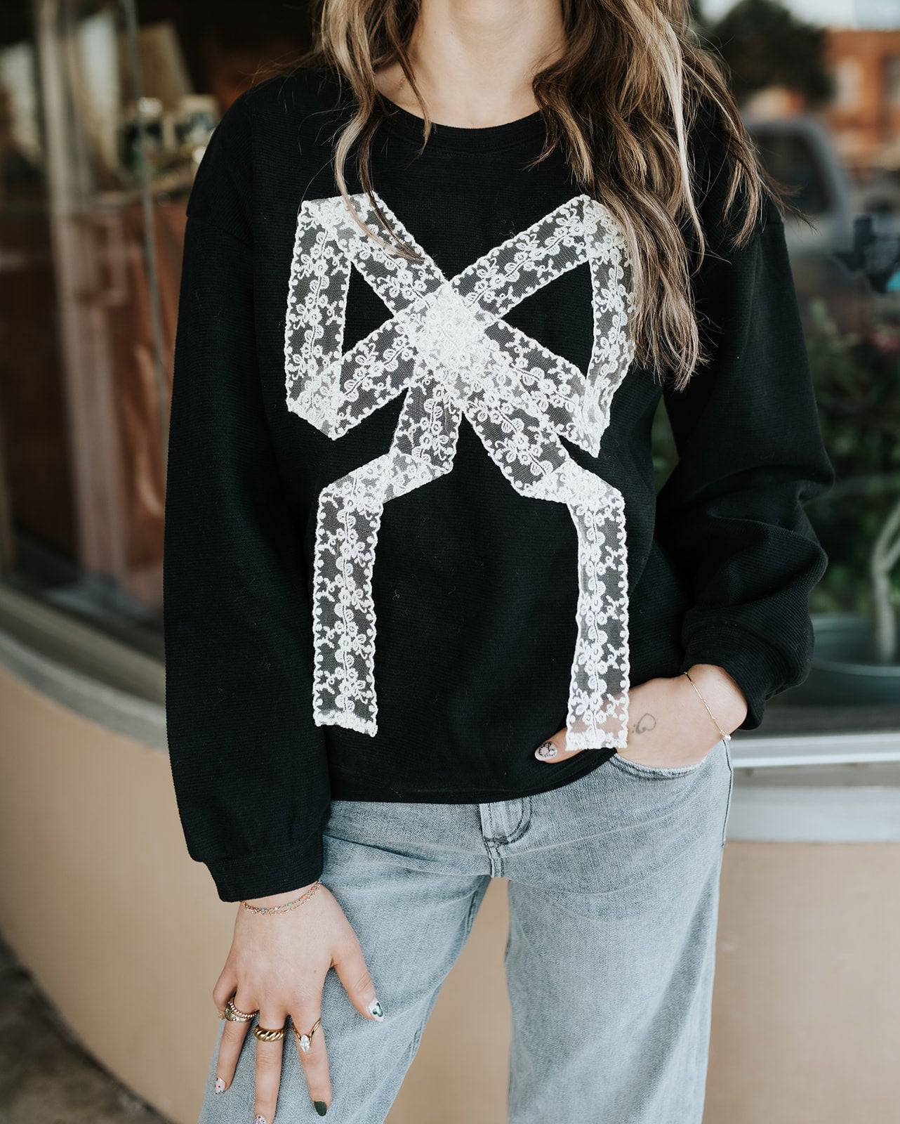 Sweet with a little edge, the Lace Bow Sweatshirt puts a feminine twist on an everyday favorite. Featuring a bold lace bow detail against a classic black base, this sweatshirt is cozy, eye-catching, and effortlessly cool all at once. It’s the kind of piece that makes a simple outfit feel instantly styled.