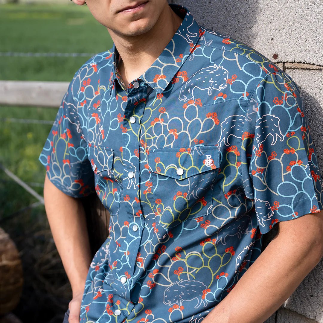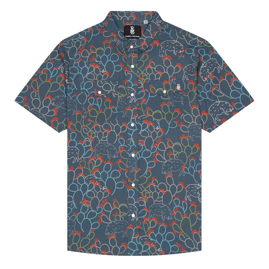 The Javelina Paradise pearl snap western shirt features a javelina and prickly pear pattern, pearl snap button down, and embroidered RBC iron brand logo on the front pocket.