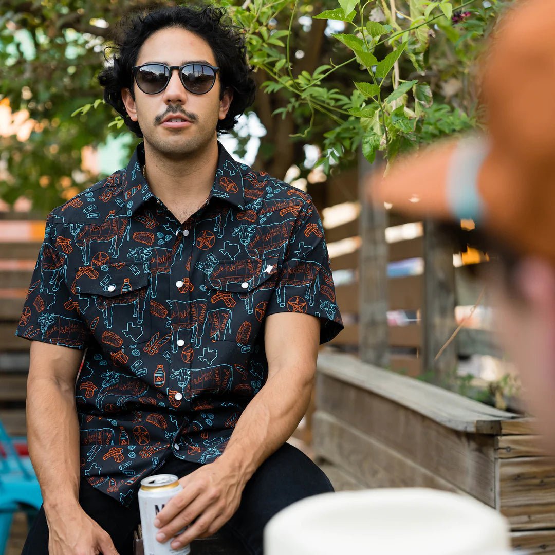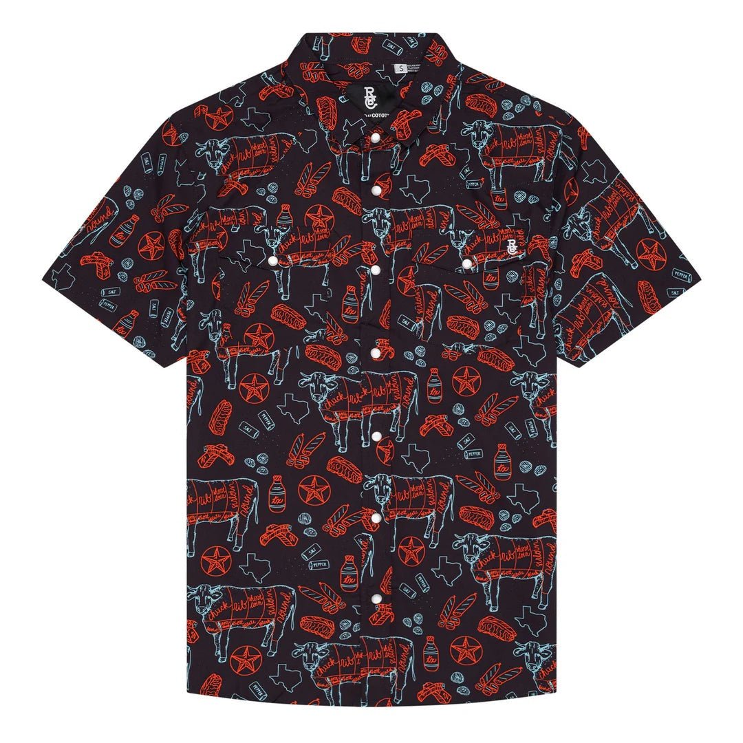 The TX BBQ Nights pearl snap western shirt features a beef cuts chart, brisket, ribs, sausage and fixin's pattern, pearl snap button down, and embroidered coyote head on the front pocket.