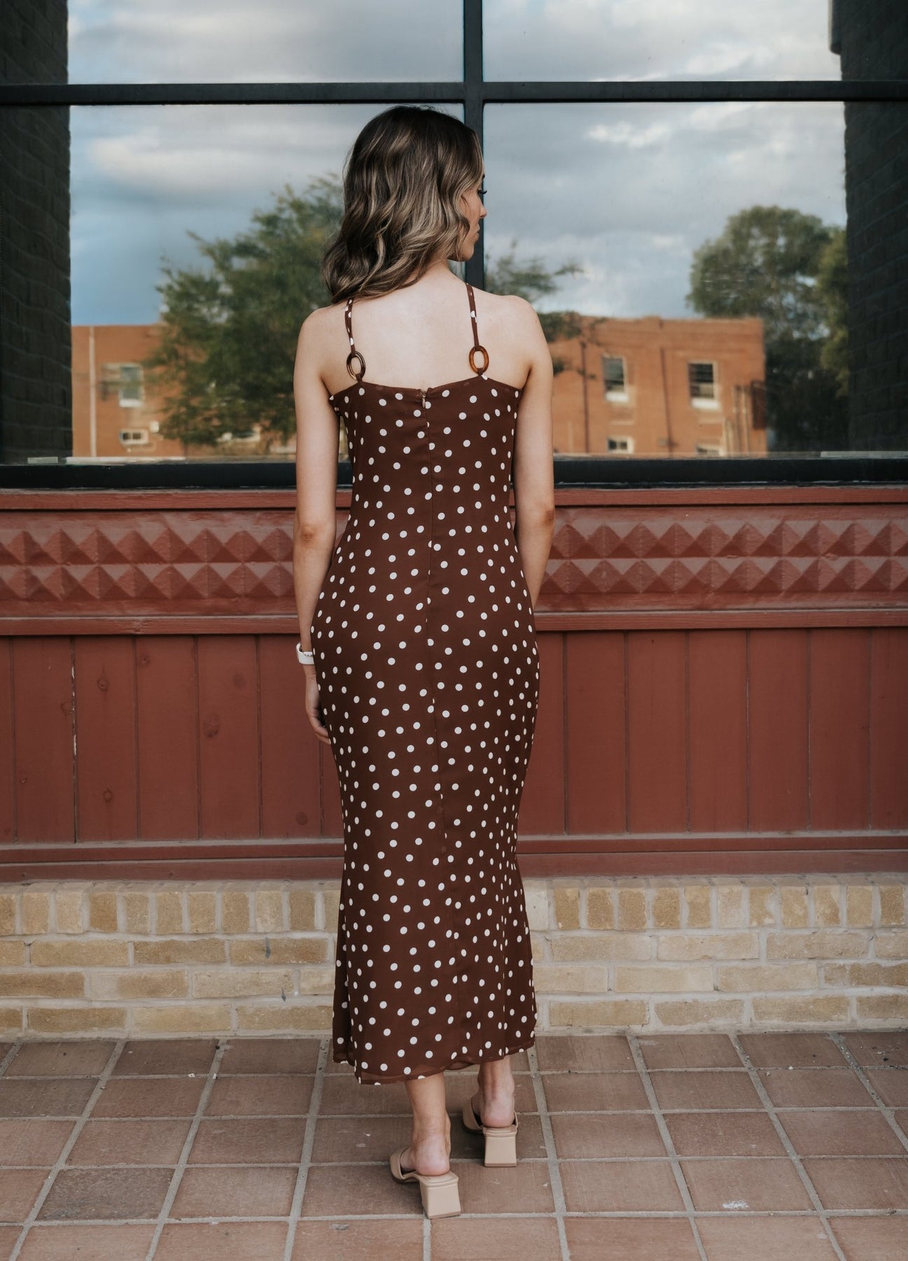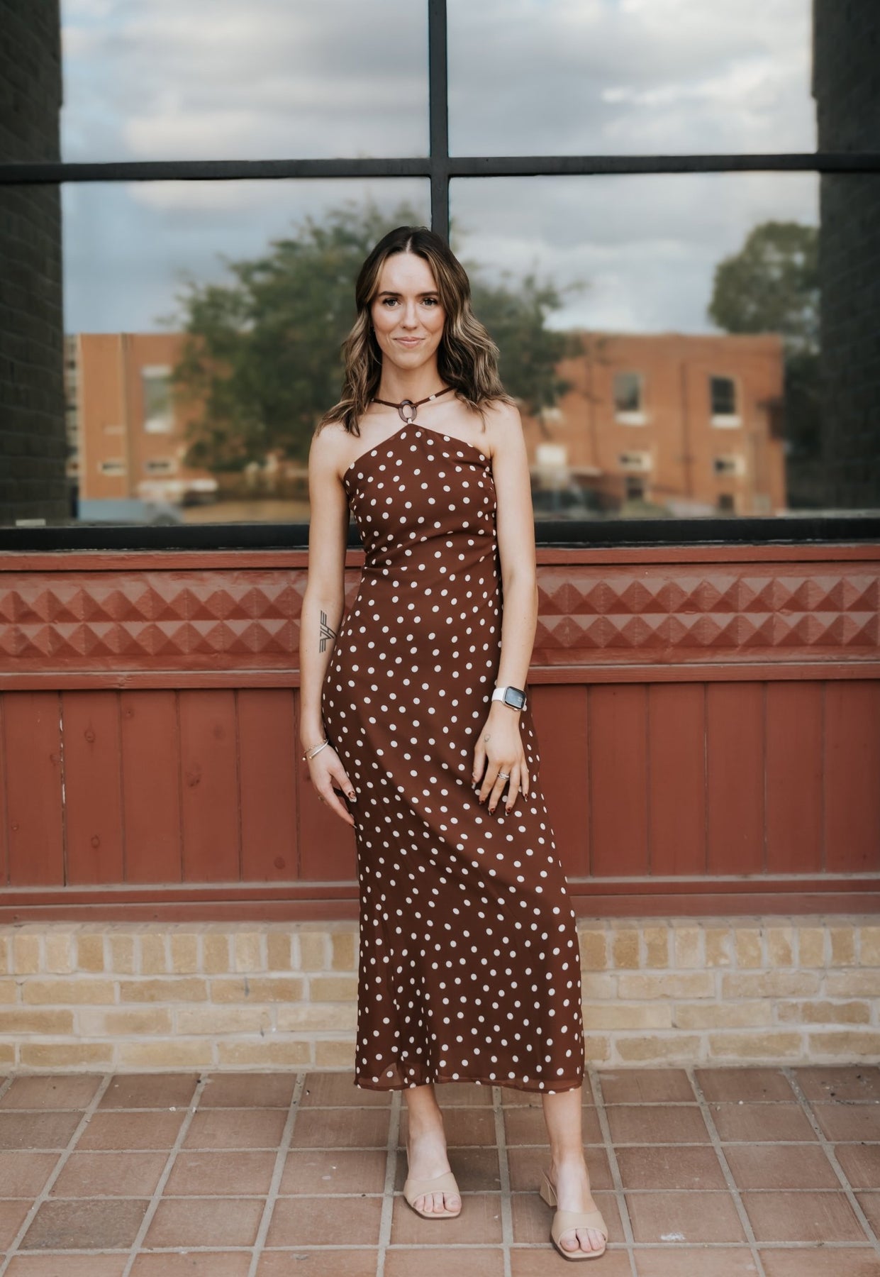 Flirty, feminine, and timeless — the Brown Jane Polka Dot Midi Dress brings classic charm with a modern twist. Its silky drape and playful polka dots make it perfect for everything from brunch dates to special evenings out.