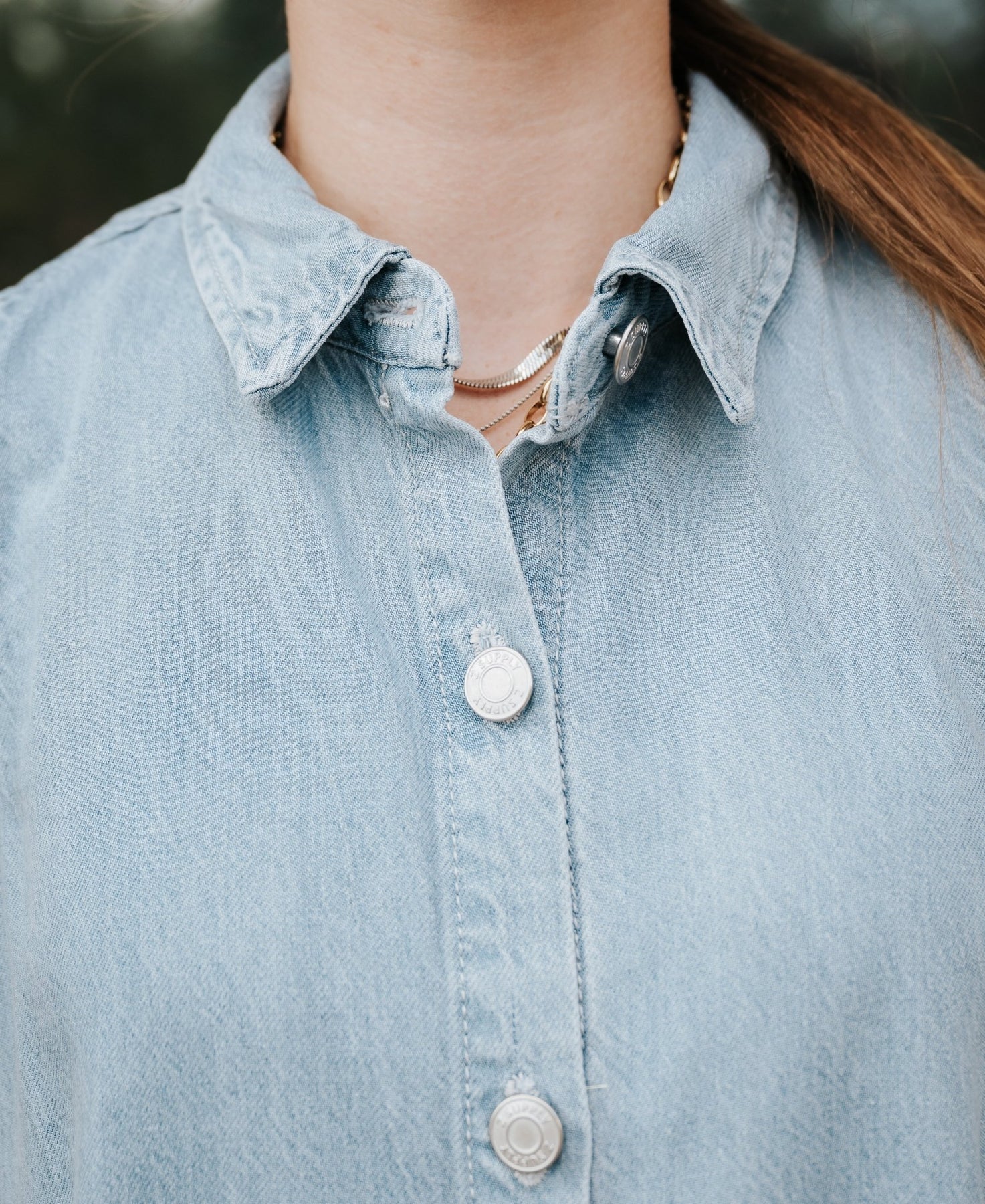 A denim-inspired favorite with a soft, feminine twist — the New Day Twill Mini Dress is perfect for easy, everyday wear. Featuring a button-front design, collared neckline, and relaxed A-line fit, this sleeveless dress offers a timeless look that transitions effortlessly from casual days to weekend outings.