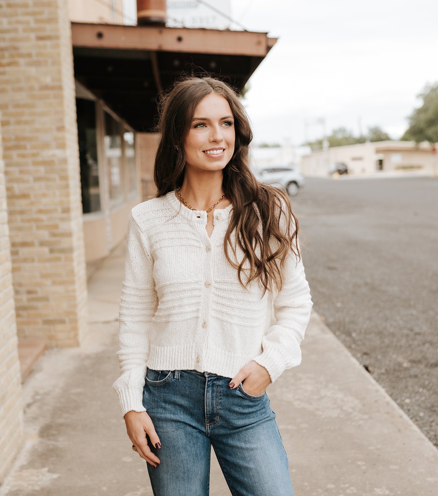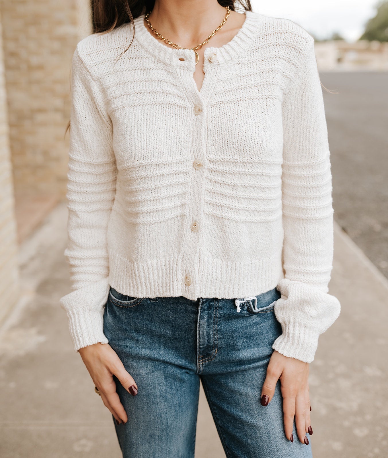 A soft, textured cardigan with a clean, elevated look. Lightweight and easy to style — perfect for layering through every season.