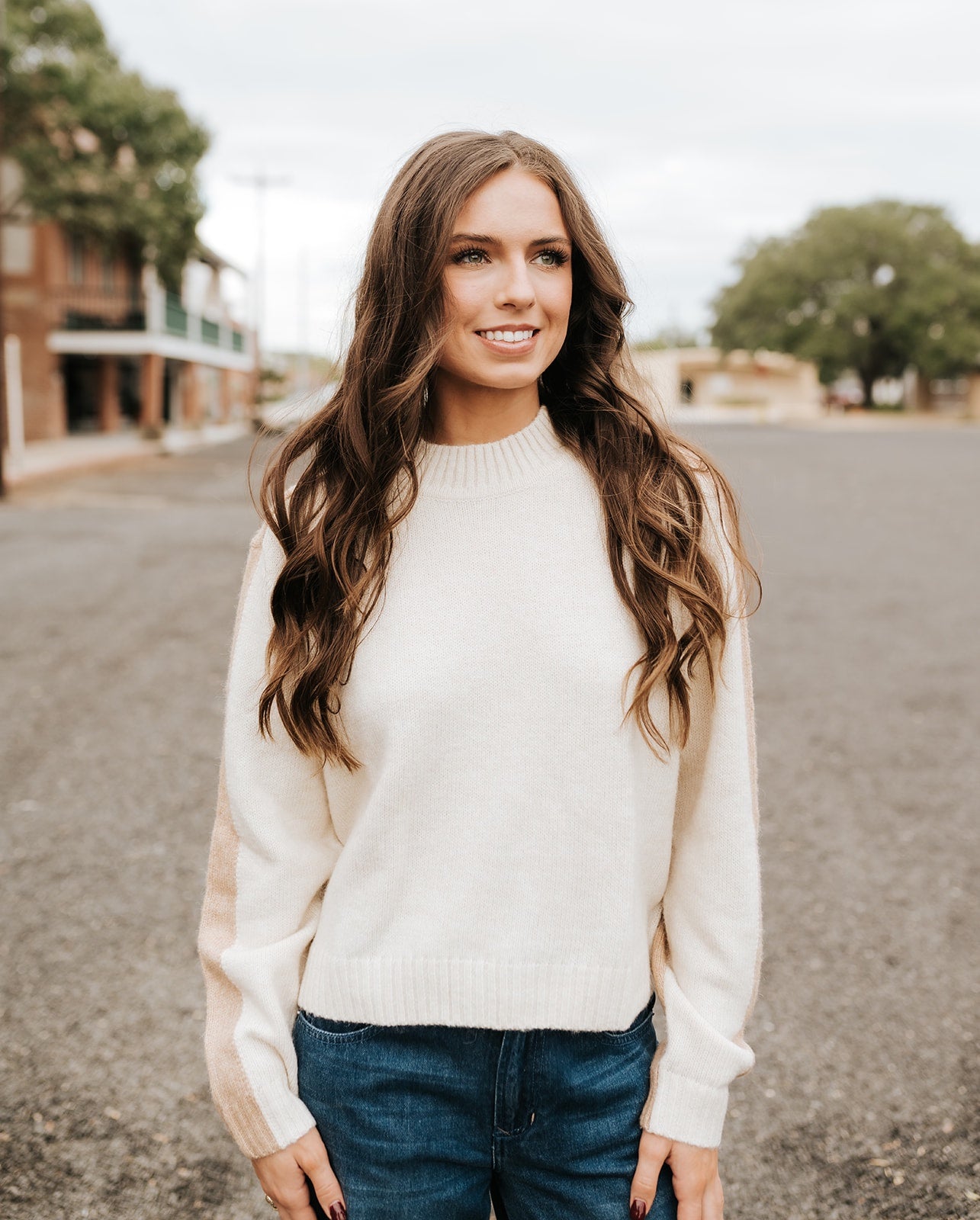 A soft, neutral sweater with subtle color-block sleeves for an elevated everyday look. Easy to dress up or keep casual — a great staple for all seasons.