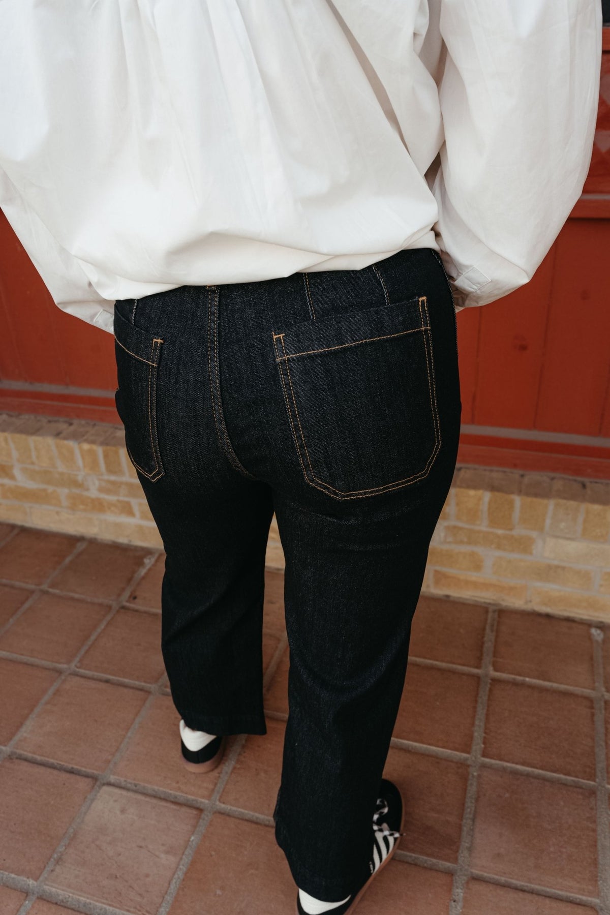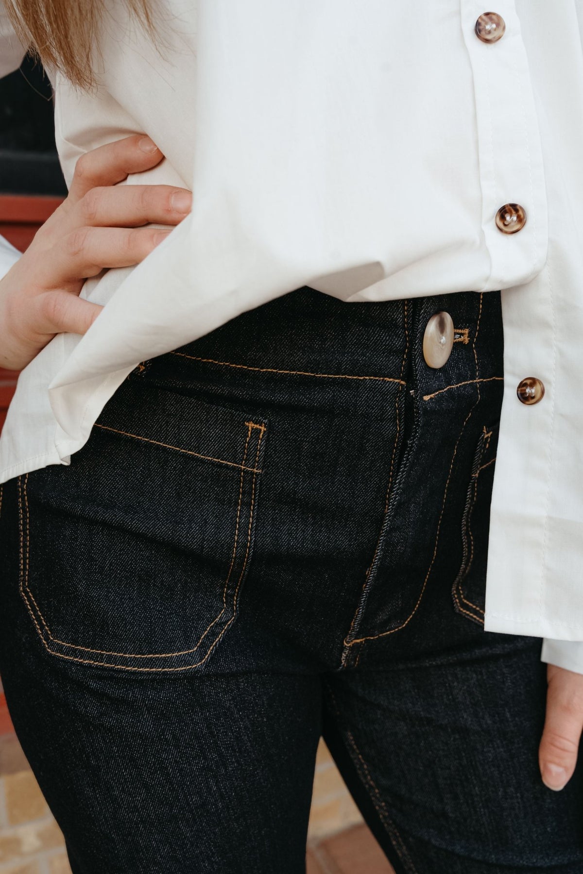 - Dark denim/black wash with contrast brown stitching for a bold, structured look