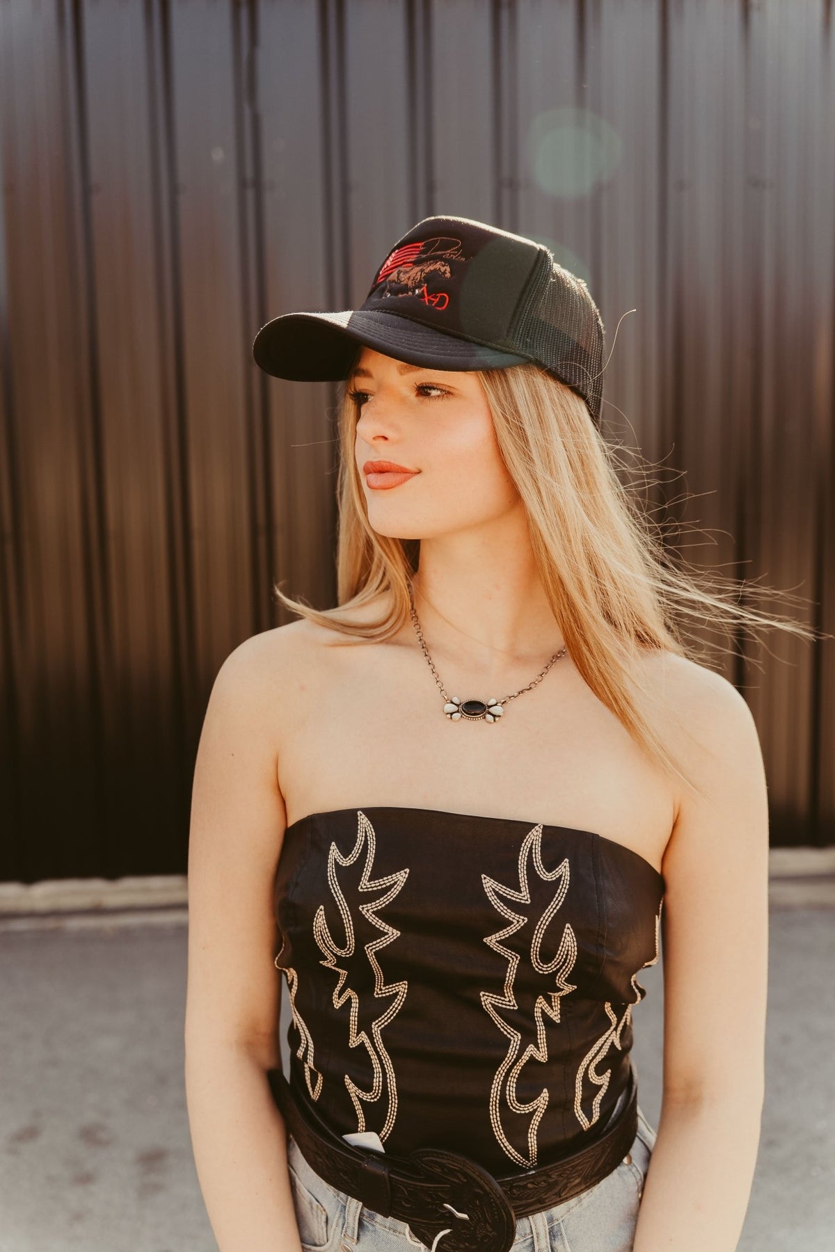 Turn up the heat with the Black Leather Boot Stitch Embroidered Corset Top—a bold blend of western flair and corset-style edge. Featuring intricate boot stitch embroidery, this top is crafted from sleek faux leather and designed with a fully adjustable lace-up corset back for the perfect fit. The structured bodice is fully lined for comfort and support, making it as wearable as it is statement-making.