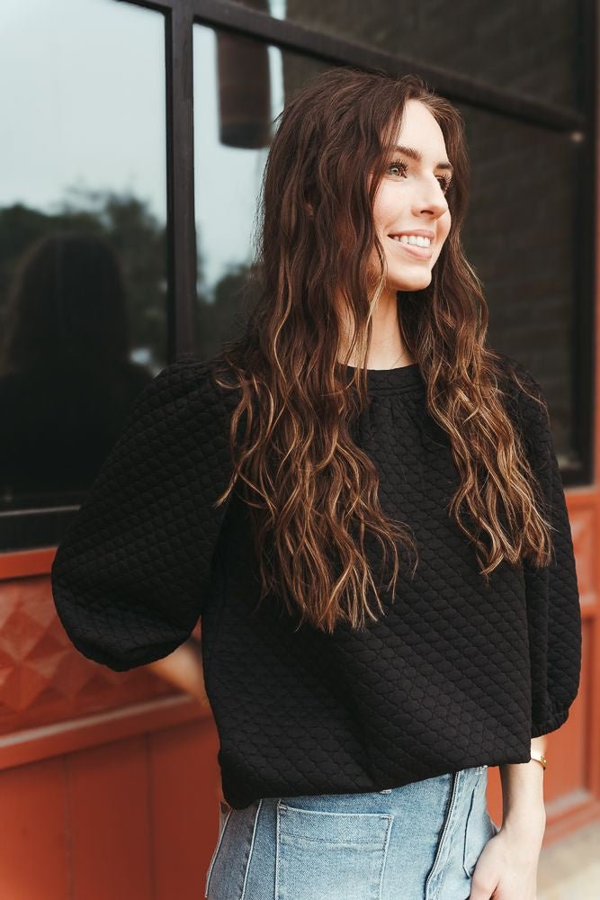 Black Quilt Textured Short Puff Sleeve Knit Top 34813