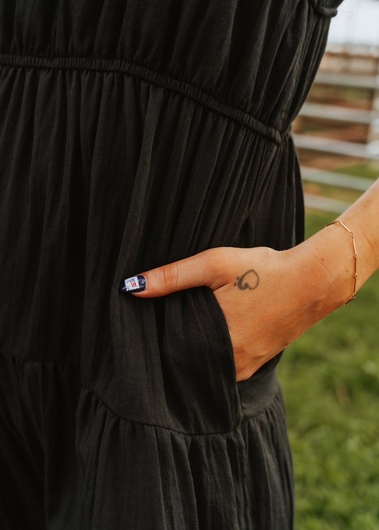 Details: Sleeveless design, gathered tiers, and pockets (yes, pockets!)
