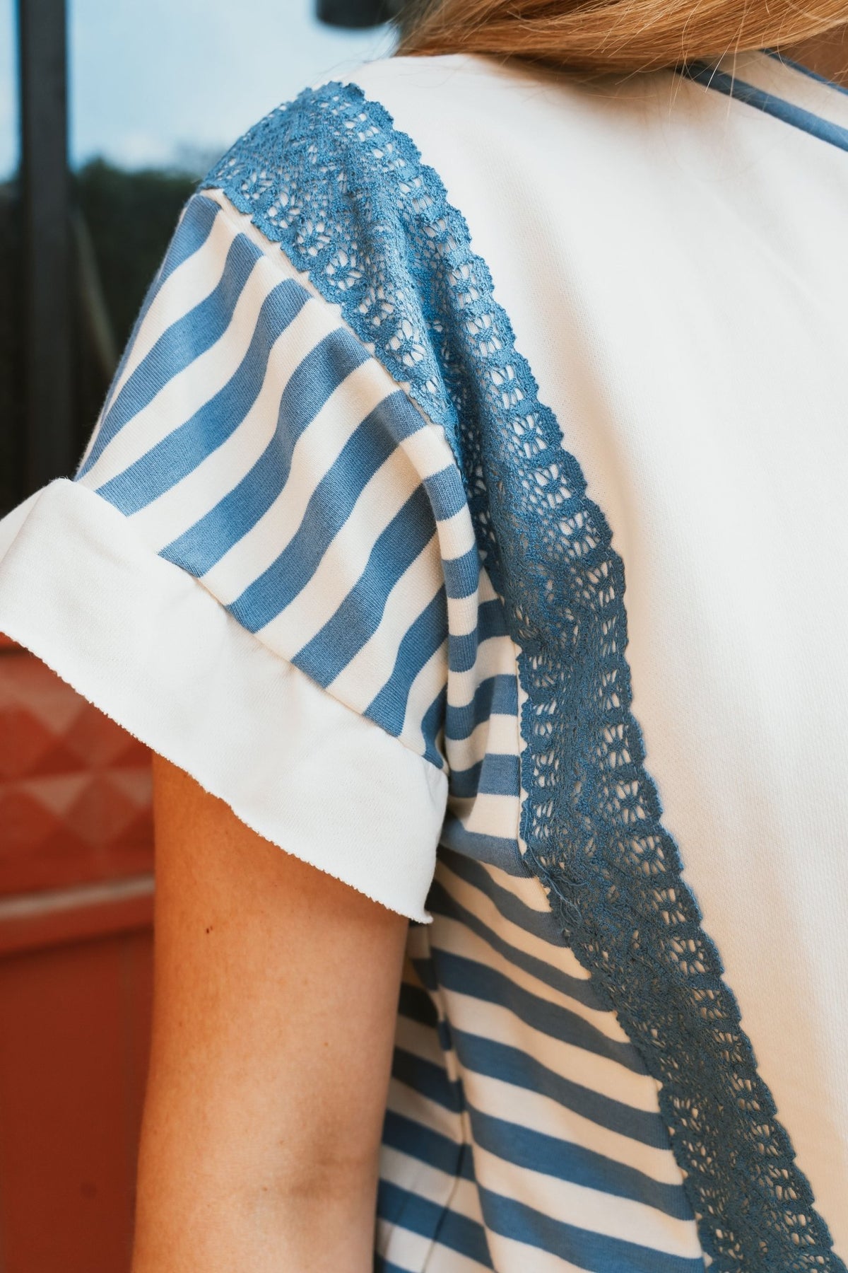 Sweet, sporty, and made to match The Blue Striped Ruffled Sleeve Top is the perfect blend of comfort and charm. Featuring soft contrast stripes, ruffled sleeves, and lace-trimmed accents, this top pairs effortlessly with the matching shorts (sold separately). Designed with a slightly oversized fit, it's breezy, flattering, and easy to throw on for laid-back summer days or lounging in style.