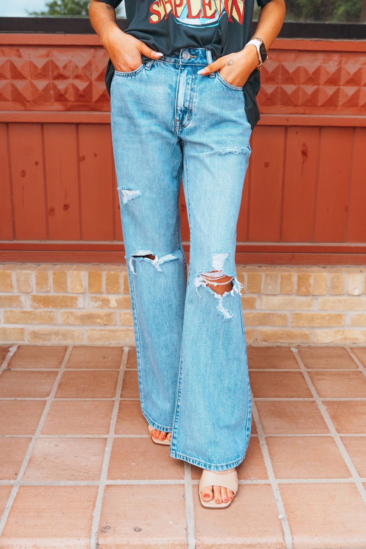 Say hello to your new favorite denim — the Light Vintage Wide Leg Jeans are made for laid-back cool with just the right amount of edge. Featuring a high-rise fit, vintage light wash, and distressed detailing on the front, these jeans bring effortless style to any outfit. The wide flare leg adds a trendy throwback vibe, while the 100% cotton fabric gives you that authentic denim feel. Reiley is a size 1 wearing a 25.
