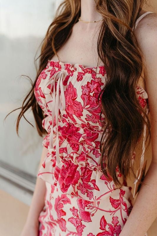 The Cherry Blossom Floral Smocked Cami Top is a delicate and charming addition to your wardrobe, perfect for warm-weather styling. Designed with adjustable straps for a customizable fit, this cropped-length cami features stretchy smocking for a flattering, body-hugging silhouette. A dainty front bow detail adds the perfect feminine touch, making this top a must-have for effortless, romantic looks.