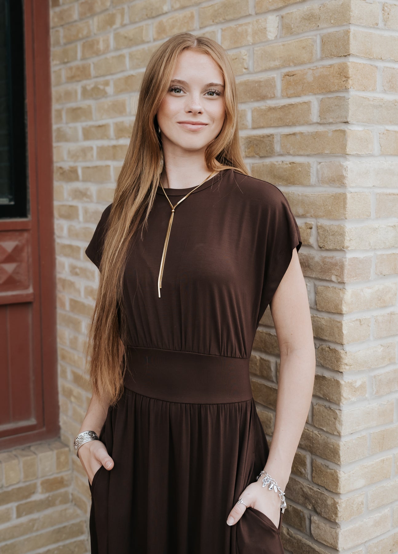 Soft, flattering, and easy to wear — the Cocoa Short Sleeve Midi Dress is your new go-to for effortless style. Designed with a cinched waistband and flowy skirt, it creates a comfortable yet polished silhouette that’s perfect for any occasion.