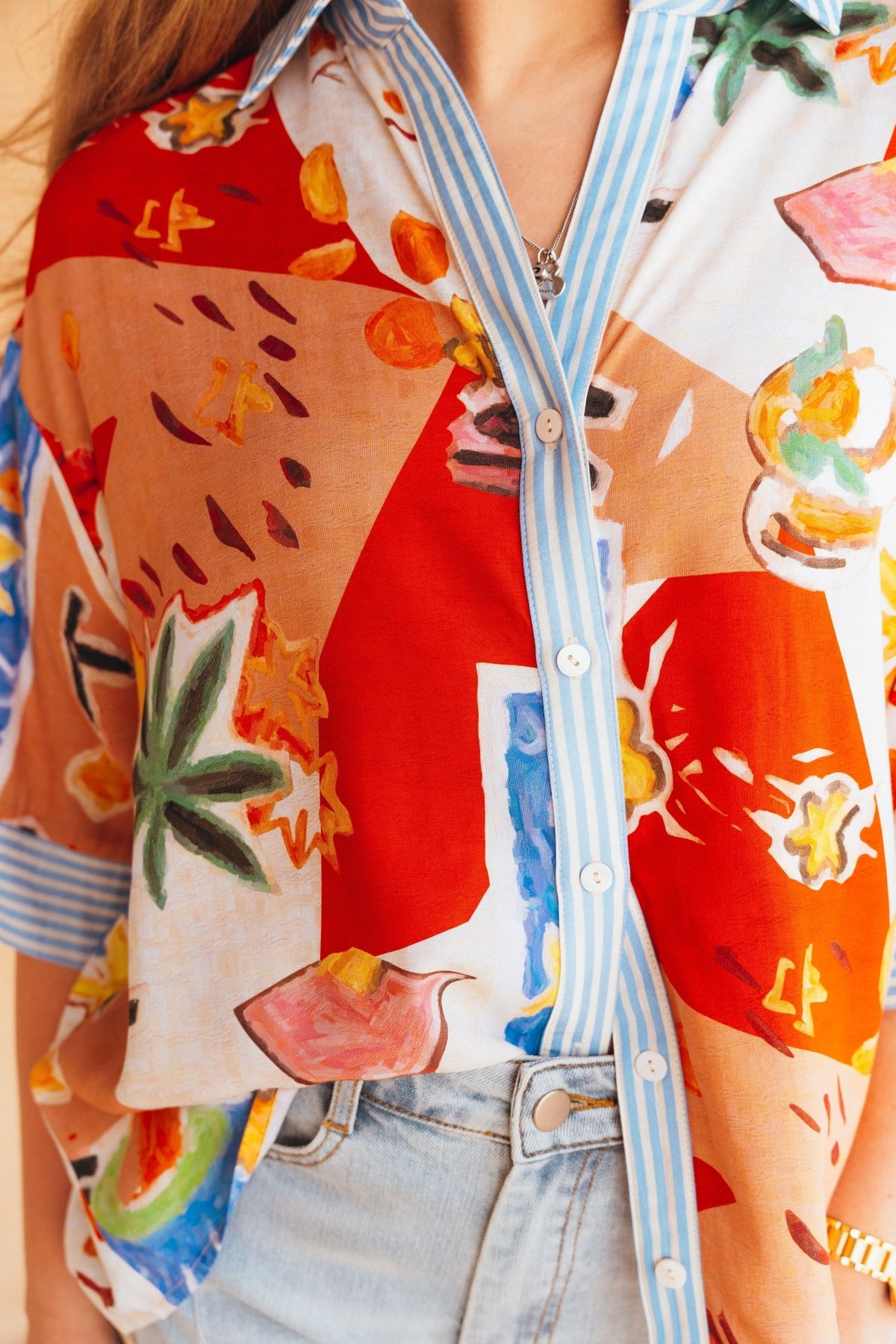 Make a statement in color The Colorful Printed Blouse with Blue/White Stripe Detail is the perfect mix of playful and polished. Designed with a bold, artsy print and contrasting striped trim on the collar, cuffs, and button placket, this oversized top brings all the fun. Lightweight and breathable in 100% rayon, it’s easy to style tucked, tied, or loose for an effortlessly bold look.