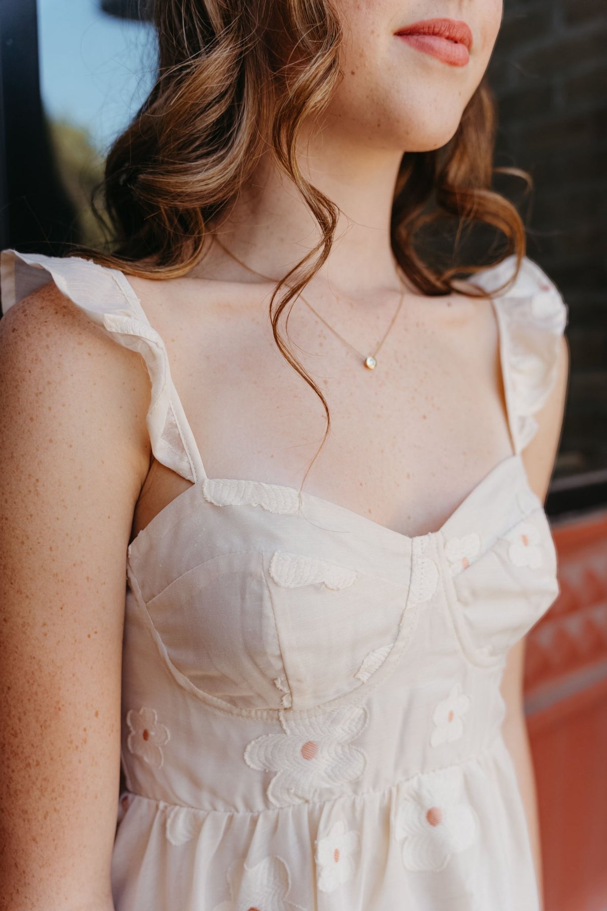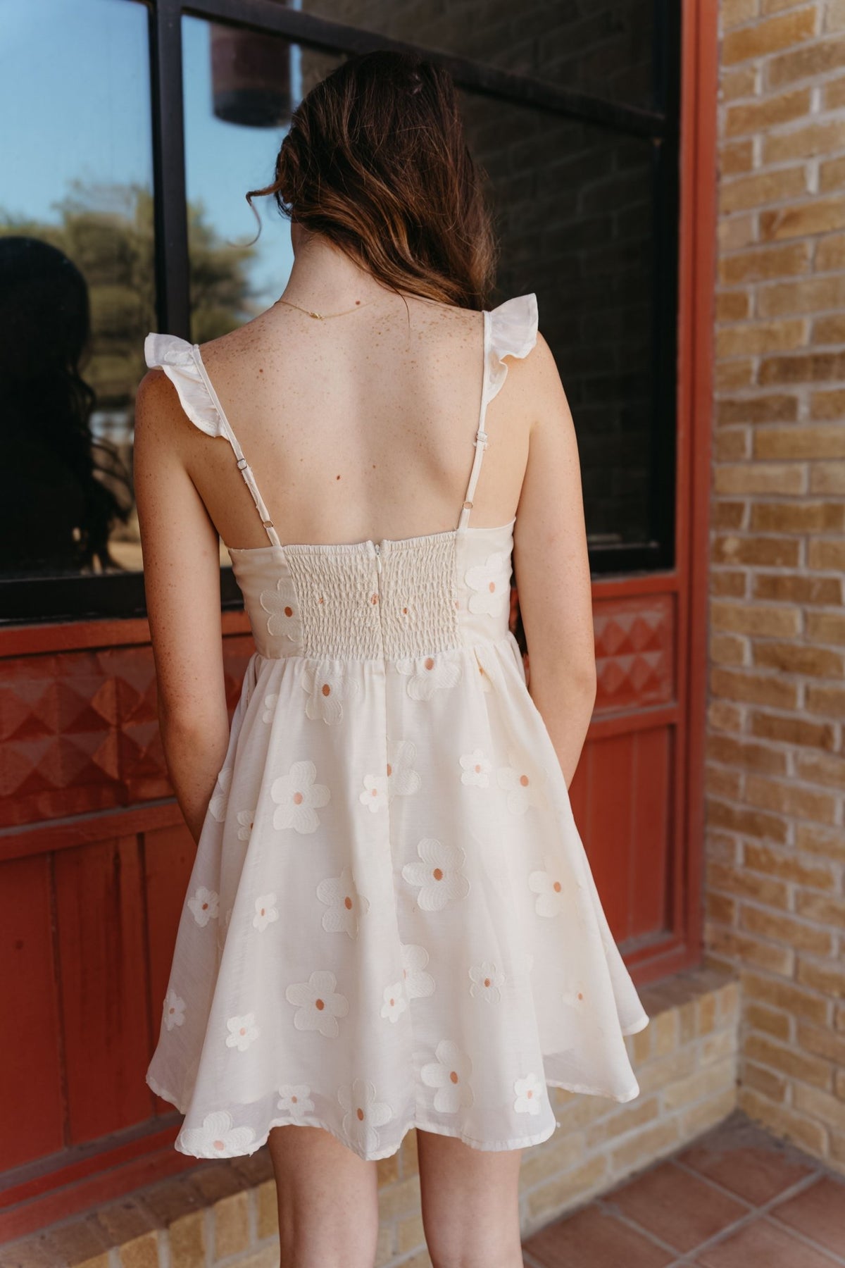 Delicate and dreamy This cream floral dress features adjustable ruffle straps, embroidered floral detailing, and a flattering silhouette with an elastic back and zipper closure for a flexible, comfortable fit. Fully lined and lightweight, it's perfect for warm-weather occasions or weekend outings.