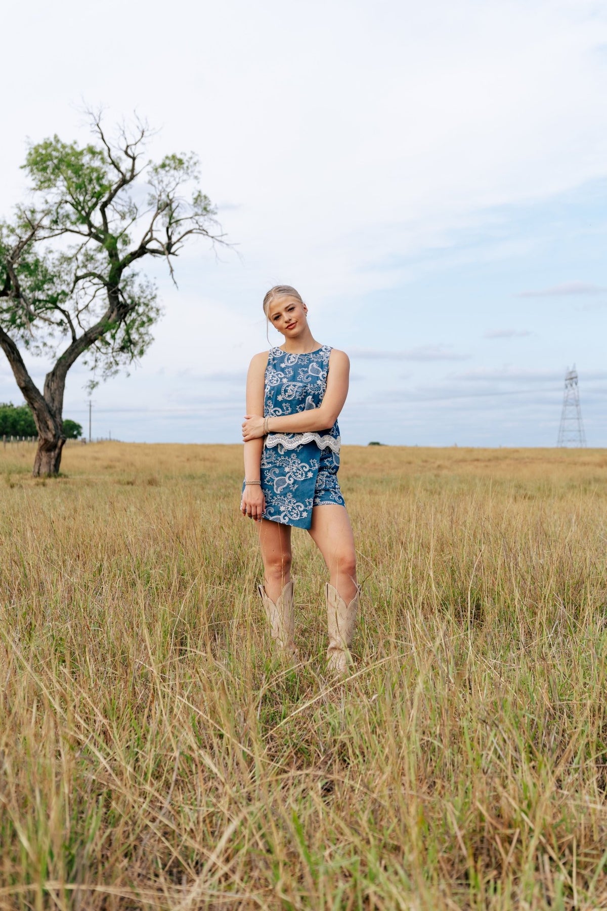 The perfect match to our wrap skort, this sleeveless embroidered top is full of sweet western flair. From the detailed paisley stitching to the scalloped lace trim, every element adds charm. Ideal for summer days or rodeo nights.