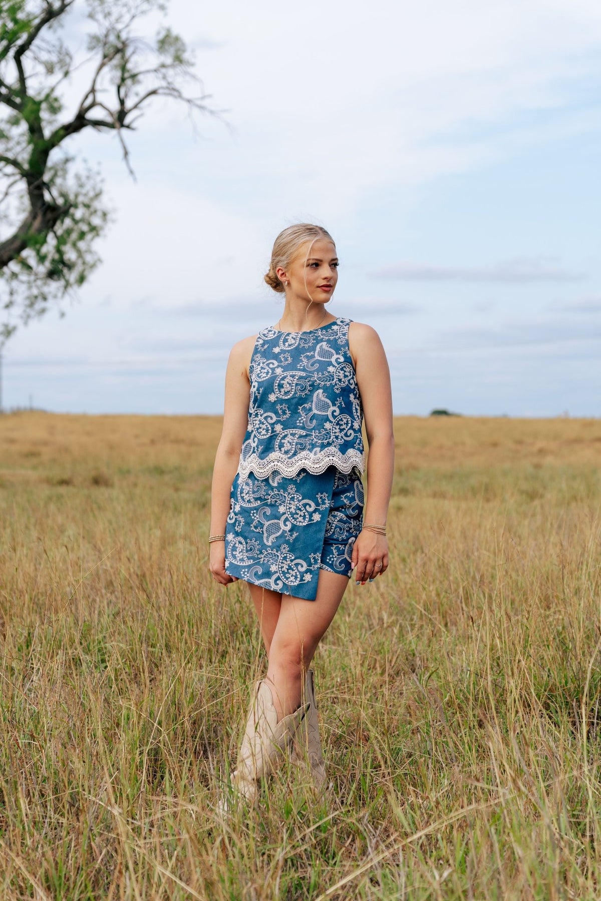 This feminine-meets-western skort brings all the charm with a paisley embroidered design, scalloped lace detail, and a flattering wrap-front silhouette. Perfect for rodeo days or brunch plans, it’s fully lined and finished with pockets for a touch of function.