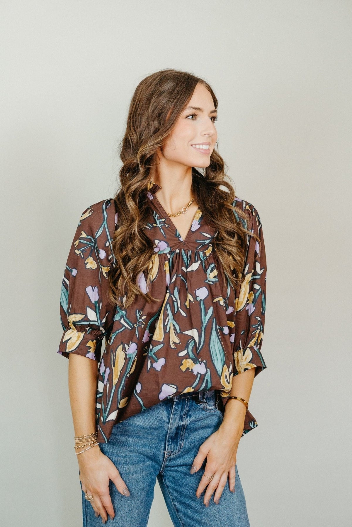 Espresso Floral V-Neck Half Sleeve Blouse T24097