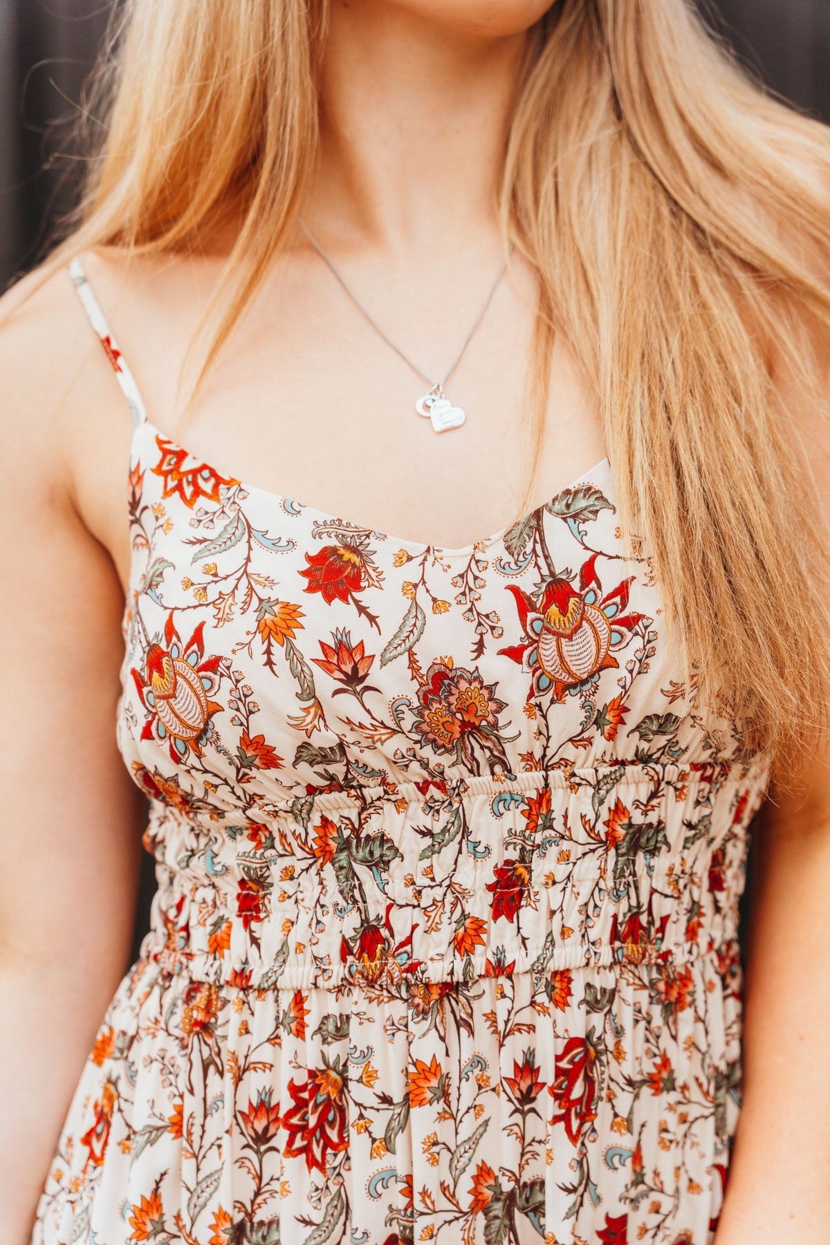 A fresh floral moment with effortless charm. This cream midi dress is crafted from 100% rayon and features a smocked waist, flattering slit, and adjustable spaghetti straps for a comfy custom fit. The fall-toned floral print adds warmth and versatility, making it the perfect pick for brunch, weddings, or a sunset stroll in boots.