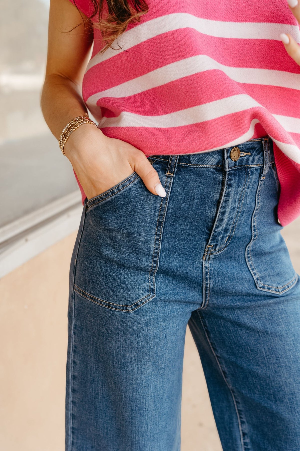 The Fritz Jeans are the perfect blend of style, comfort, and practicality! Designed in a versatile medium wash, these crop wide-leg jeans bring a modern, fashion-forward touch to your wardrobe. Featuring oversized front pockets for convenience and crafted from a stretch denim blend of 76% cotton, 22% polyester, and 2% spandex, they offer a comfortable, flexible fit that moves with you.