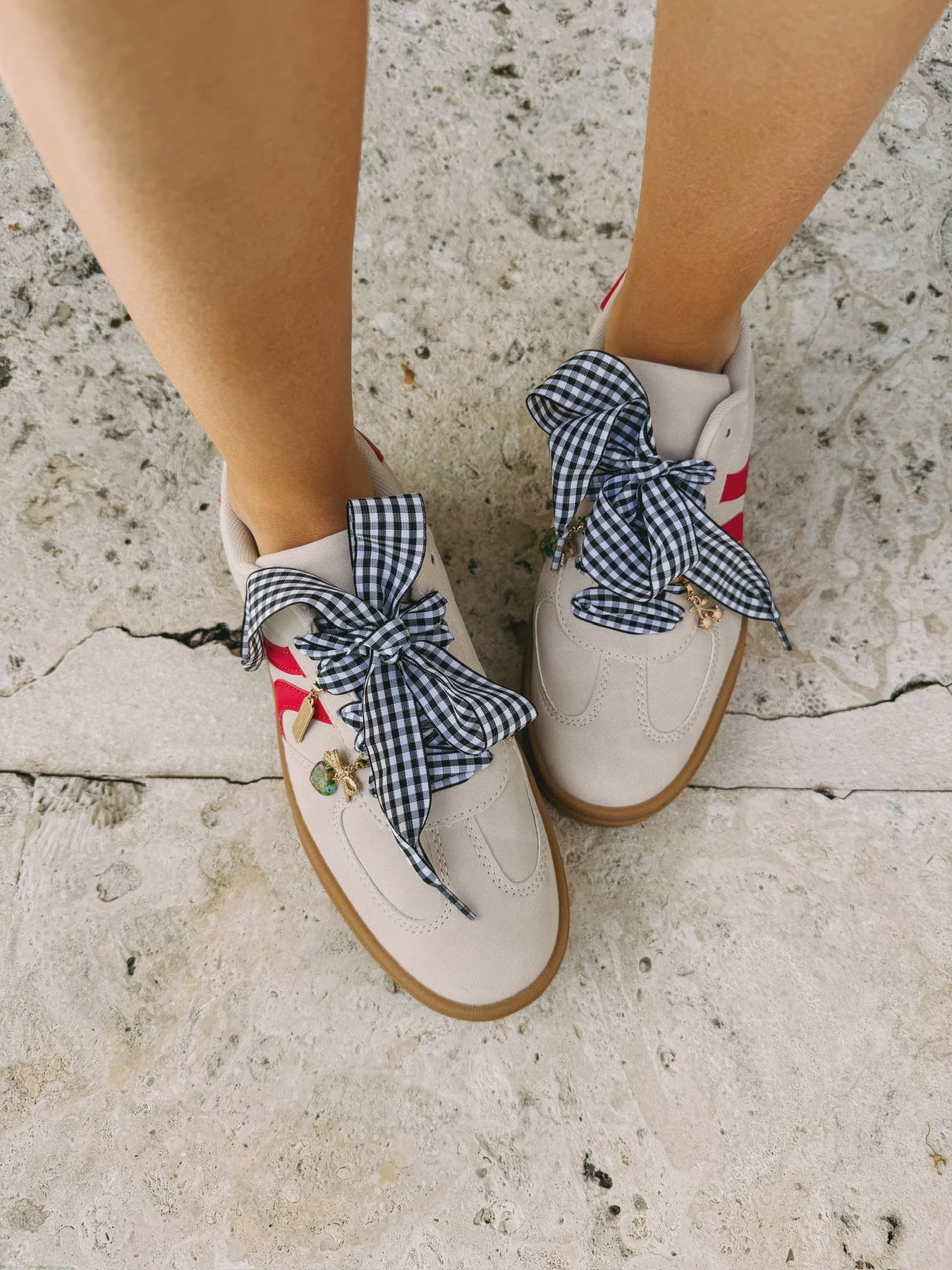 Give your kicks a personality upgrade with these black and white gingham shoelaces, complete with six playful charms that clip on for extra flair. Each set includes two rhinestone cherry charms, two floral green heart charms, and two sparkly “luck” tags—all with gold hardware for a fun, elevated finish. Whether you're switching up your sneakers or gifting a gal pal, this set is the perfect combo of cute and custom.