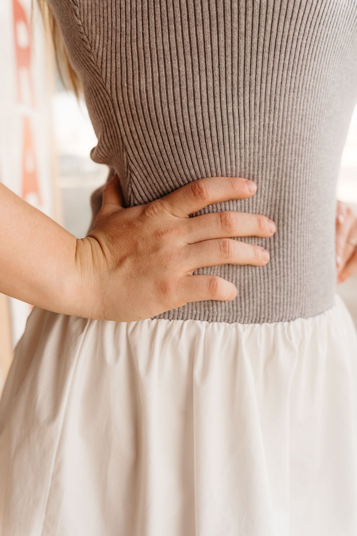 Soft, flattering, and made to twirl This fit and flare dress features a ribbed sweater knit top in heather grey with plenty of stretch for a comfortable, body-skimming fit. The white cotton ruffle skirt adds a breezy contrast and is lined for extra coverage, making it perfect for dressy-casual days.