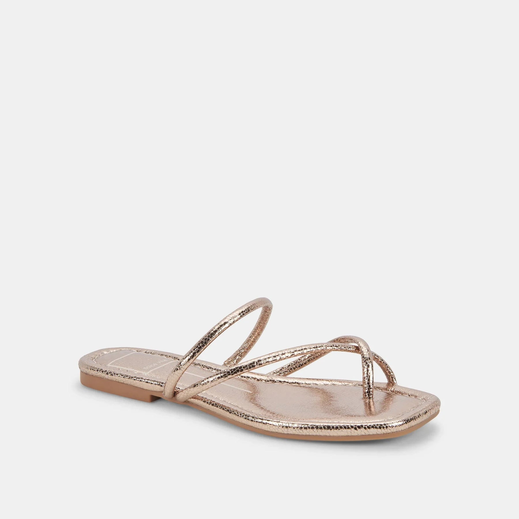Golden hour, but make it wearable. The Leanna sandal gets a luxe update with a dark gold crackled finish that shimmers with every step. Its minimalist design features a skinny strappy silhouette and toe loop, all resting on a subtly textured footbed for elevated everyday wear.