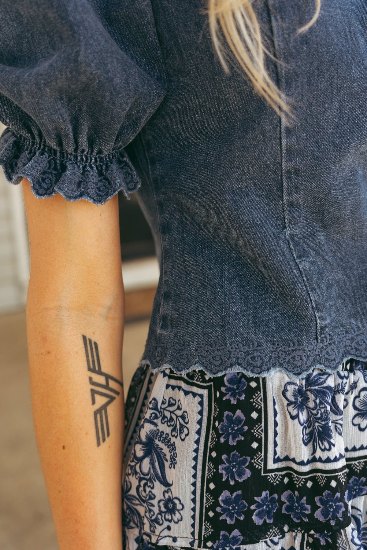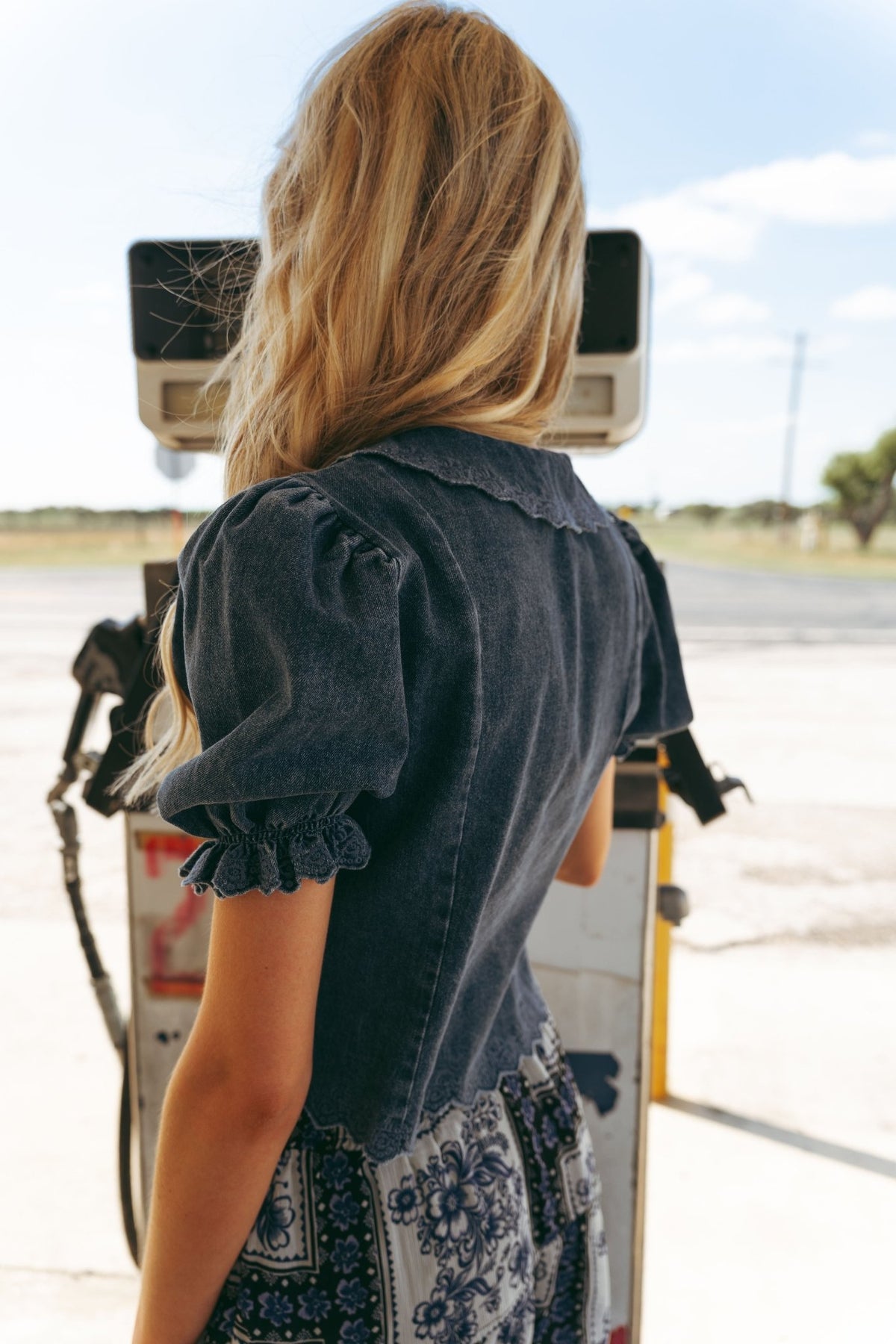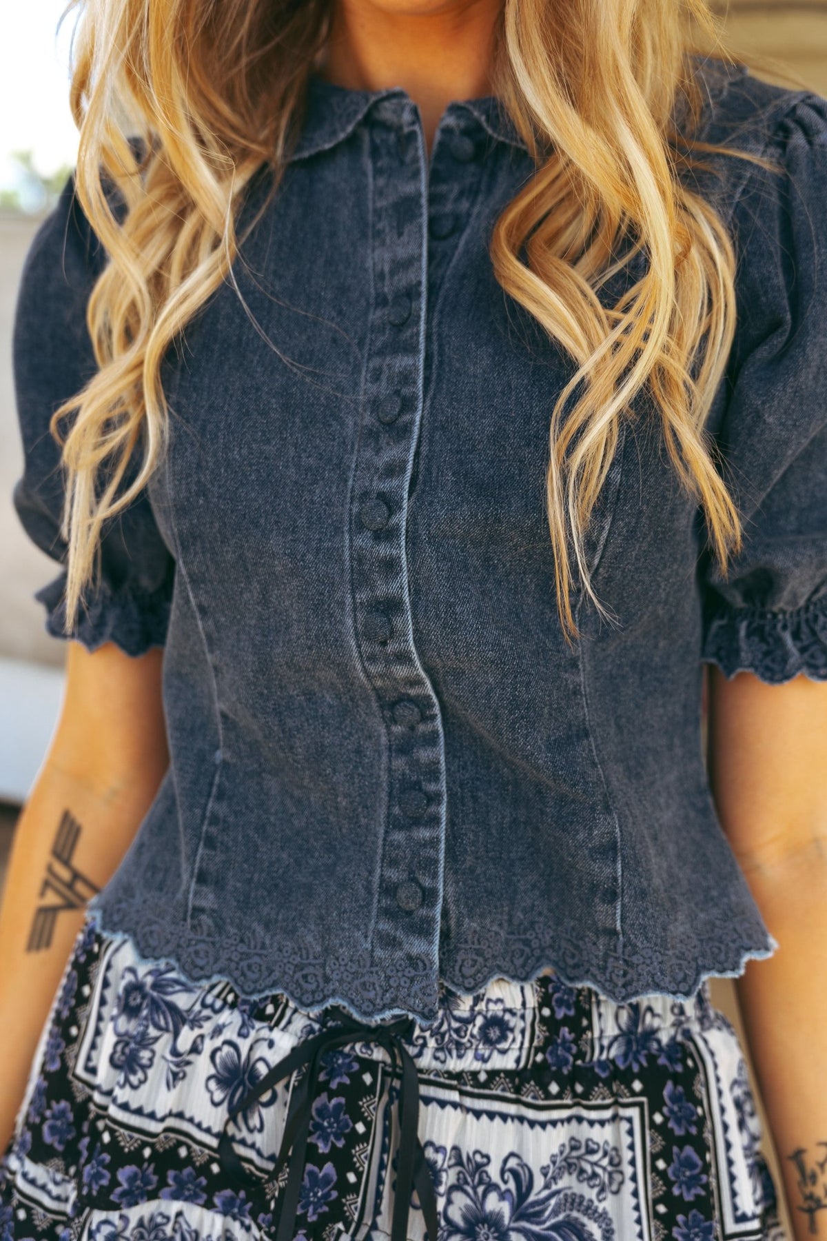 A feminine twist on classic denim! The Jaelynn Top features a flattering fit with puff sleeves, eyelet trim, and dainty scalloped details. Functional buttons down the front and a touch of stretch make it as practical as it is pretty.