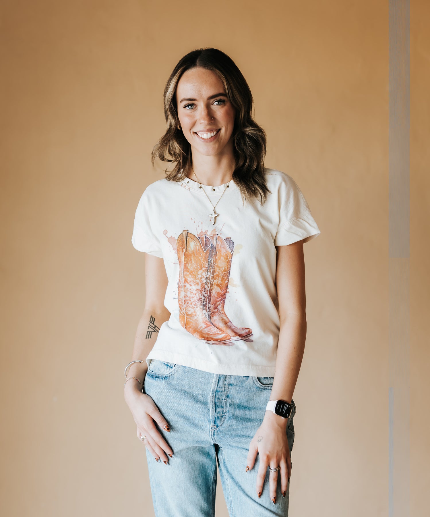 A little western, a little artsy — this watercolor-inspired boot tee is the perfect mix of casual charm and cowgirl spirit. Designed with a soft cotton feel and an easy hi-lo hem, it’s made for effortless everyday wear.