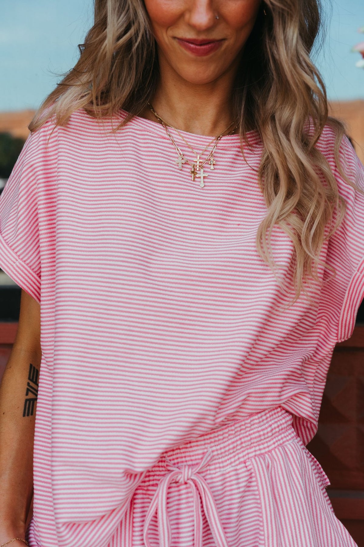 This striped French terry top and shorts set is a must for summer lounging or quick errands.
