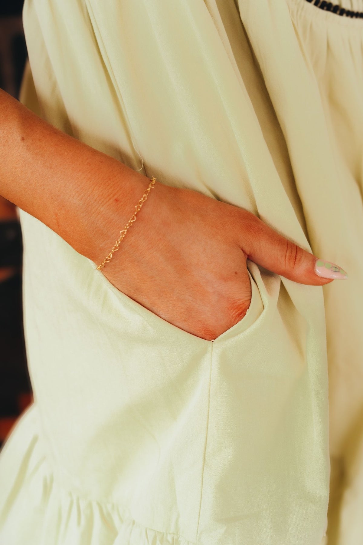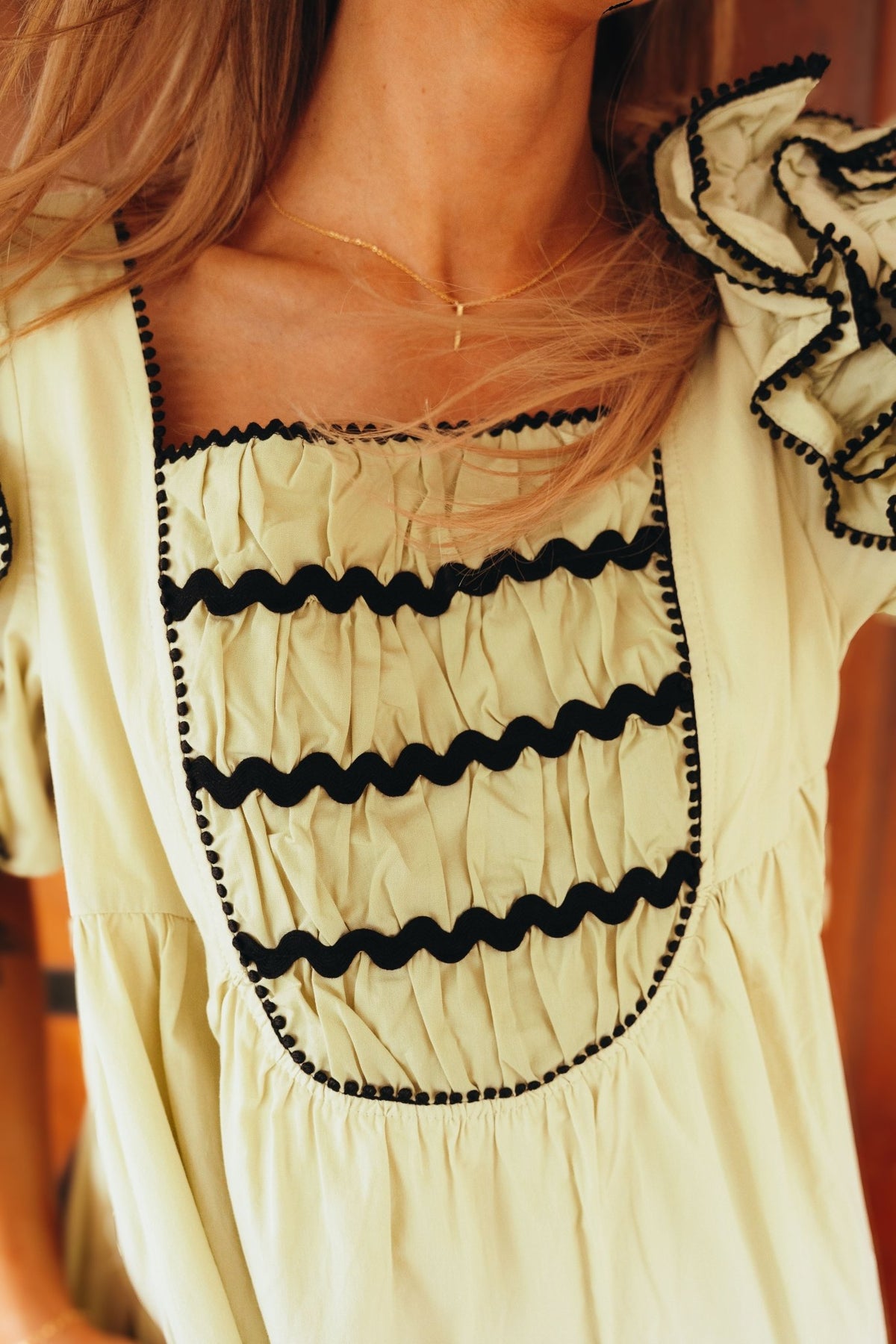 Turn heads in the sweetest shade of the season The Pistachio Contrast Stitch Ruffle Trim Dress is where charm meets bold detail. Made from 100% cotton and fully lined, it’s breathable, lightweight, and perfect for warm-weather wear. Ruffled puff sleeves with eye-catching contrast stitching add playful drama, while the gathered tiered hem keeps things easy and breezy. Whether you're dressing it up for church or twirling through the weekend, this dress is a Southern Soule fave.