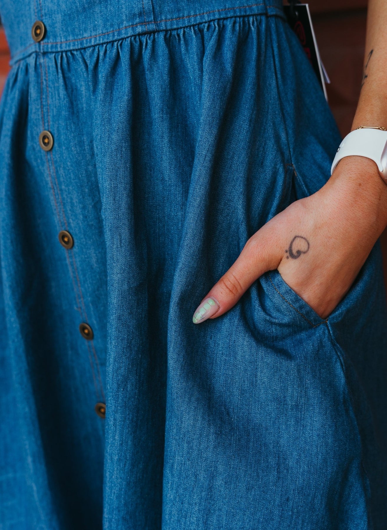 Meet your new denim obsession This Rock & Roll mini dress features a flirty button-front design, playful circle-back detail, and a twirl-worthy skirt