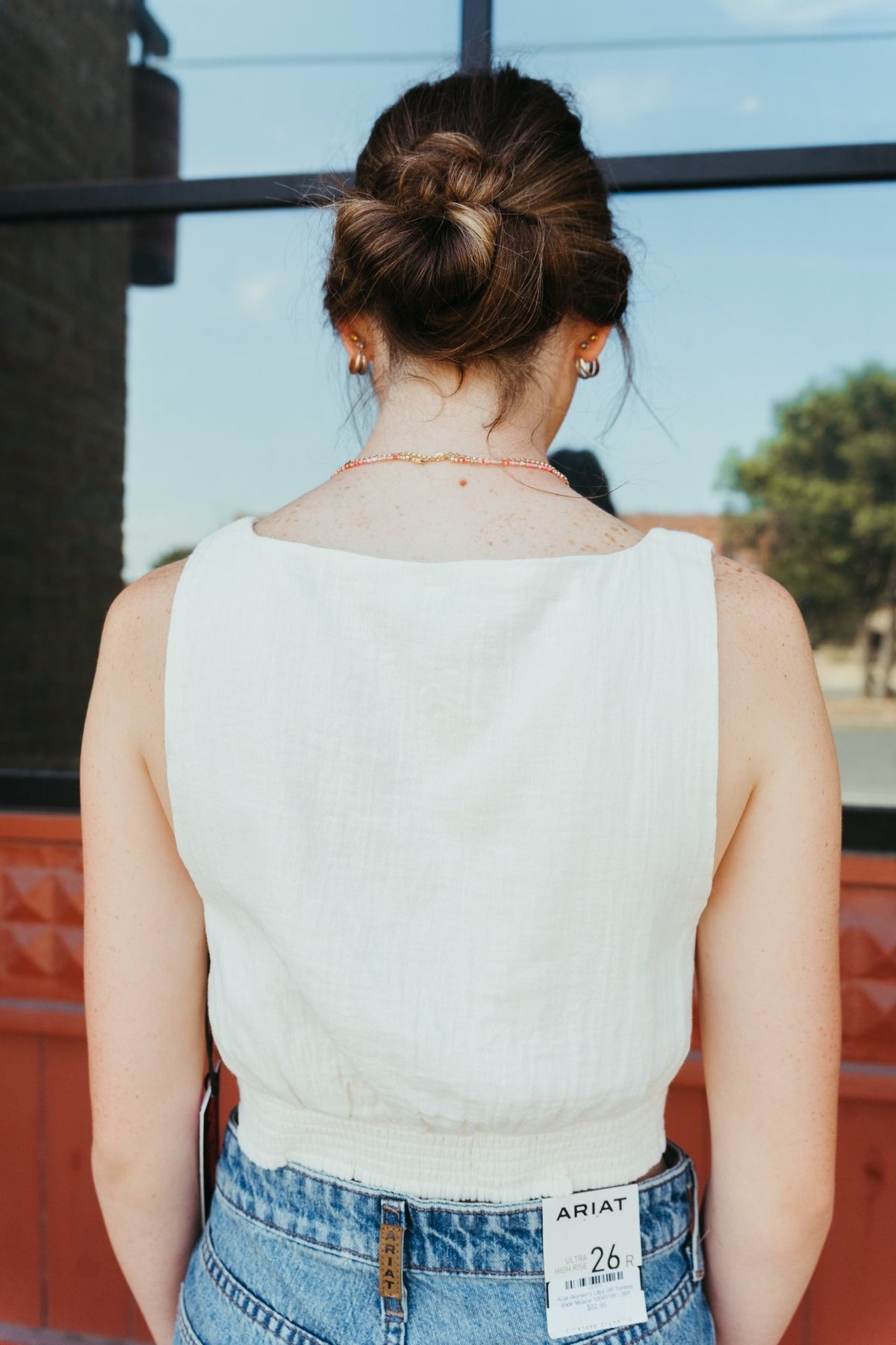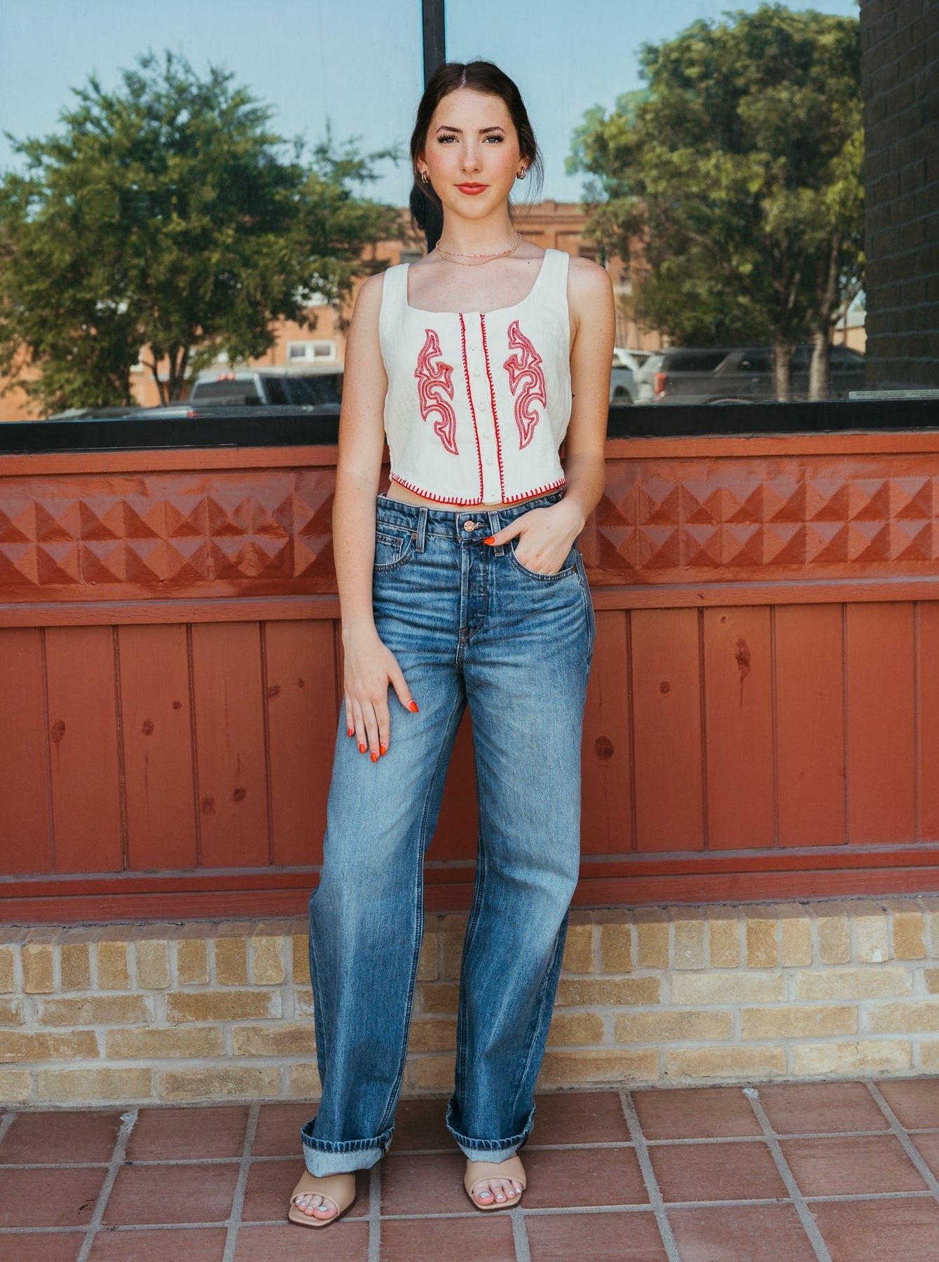 A western twist on feminine flair! This cropped button-down tank features intricate red boot-stitch embroidery on the front and whipstitch trim along the hem for bold contrast. Crafted from a breathable, lightweight cotton blend with an elasticized back for comfort and a flattering fit.