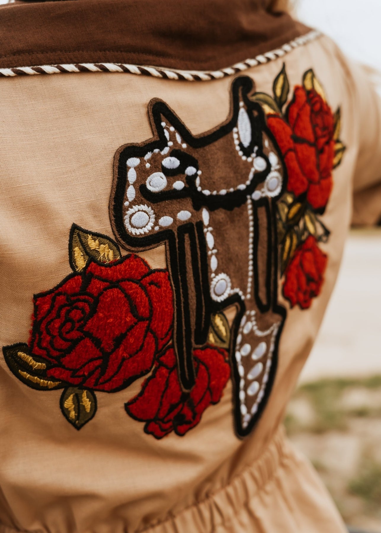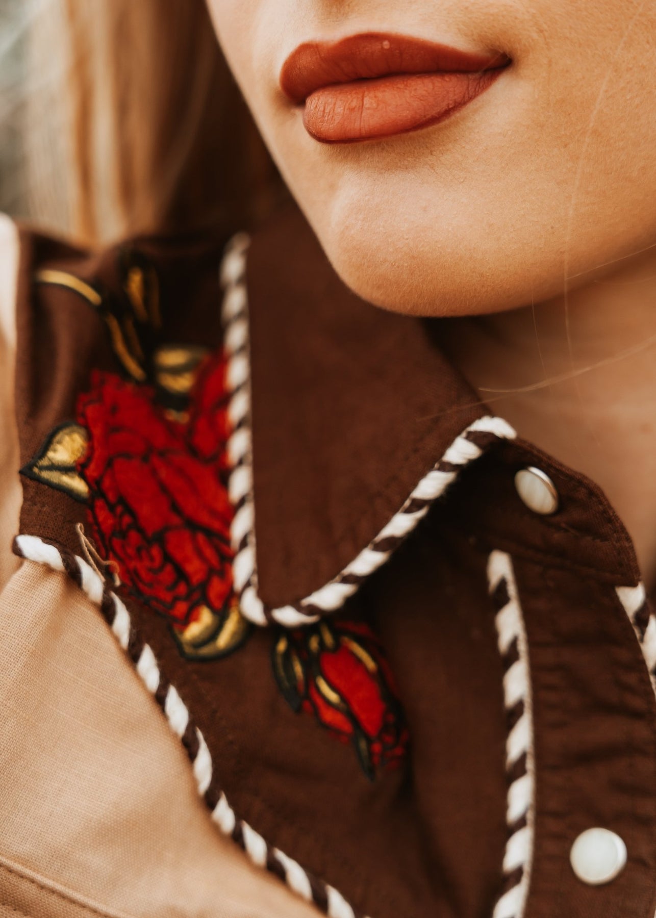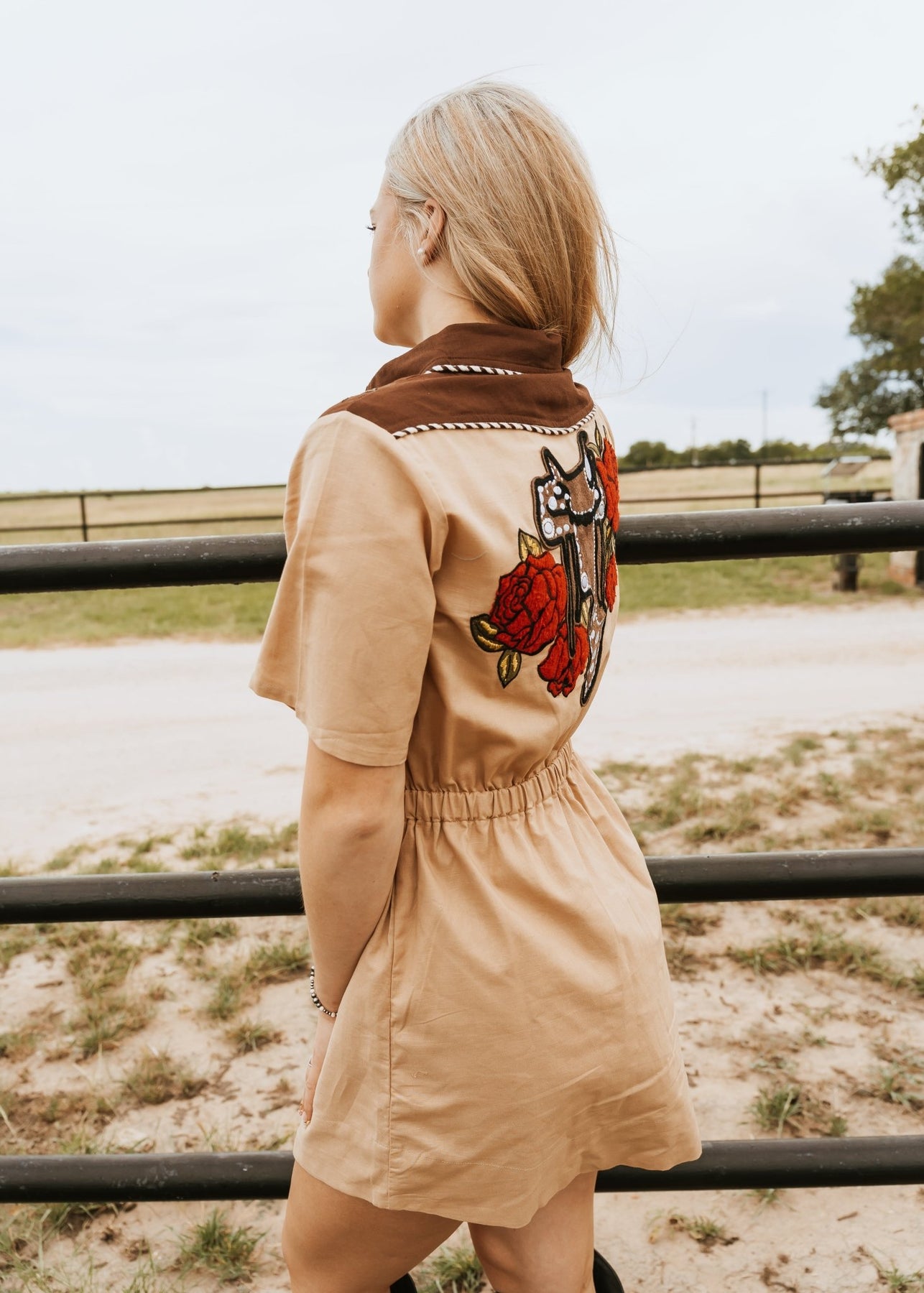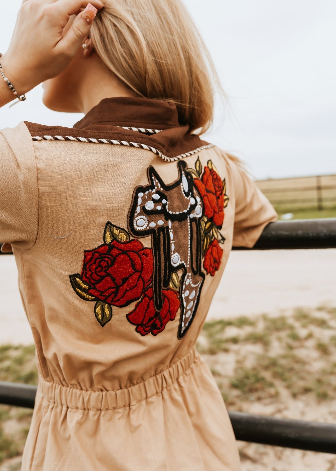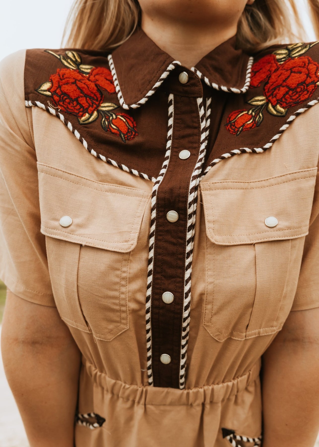 Channel vintage Western charm in this one-of-a-kind cowgirl dress! With embroidered rose detail, contrast piping, and pearl snaps, it’s a little retro, a little rodeo, and a whole lot of fun. 🌵🌹