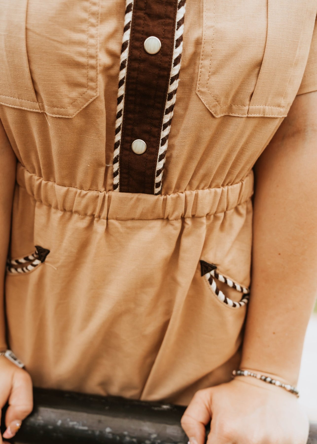 Details: Button front with pearl snap accents, flap chest pockets, and a flirty mini length