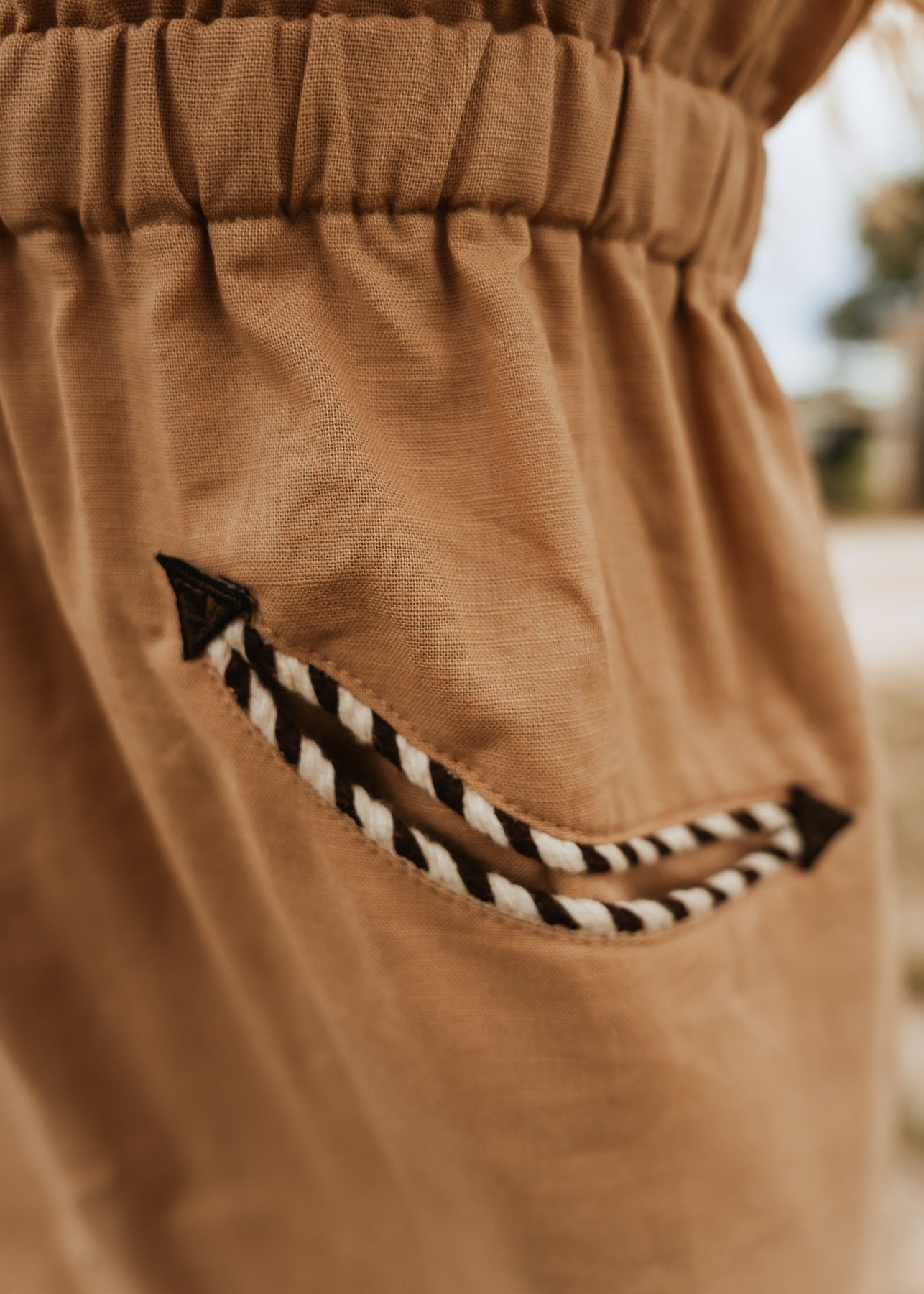 Design: Contrast yoke with rose embroidery + piped pockets and trim