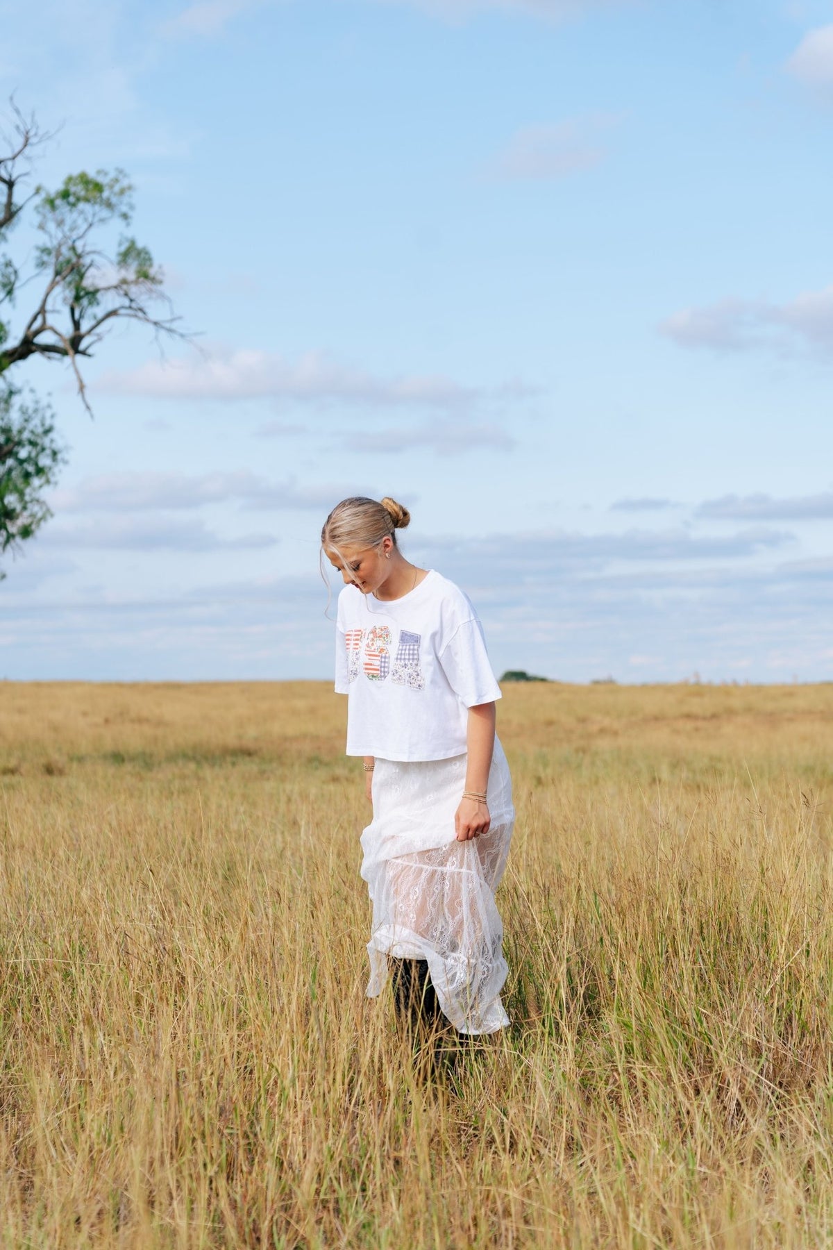 Celebrate in laid-back style with this playful patchwork tee—perfect for BBQs, fireworks, and everything in between.