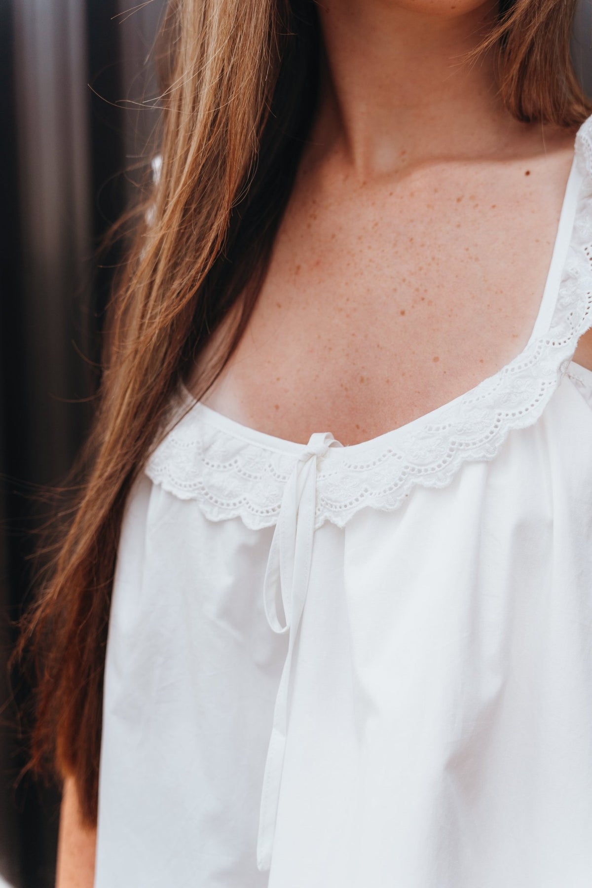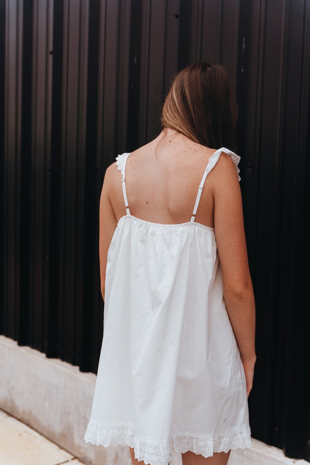 Sweet with a hint of Southern charm, this lace-trimmed mini dress is perfect for sunny days, country nights, and everything in between. With its breezy cotton fabric and dainty lace accents, it's giving effortless femininity with a touch of vintage flair.