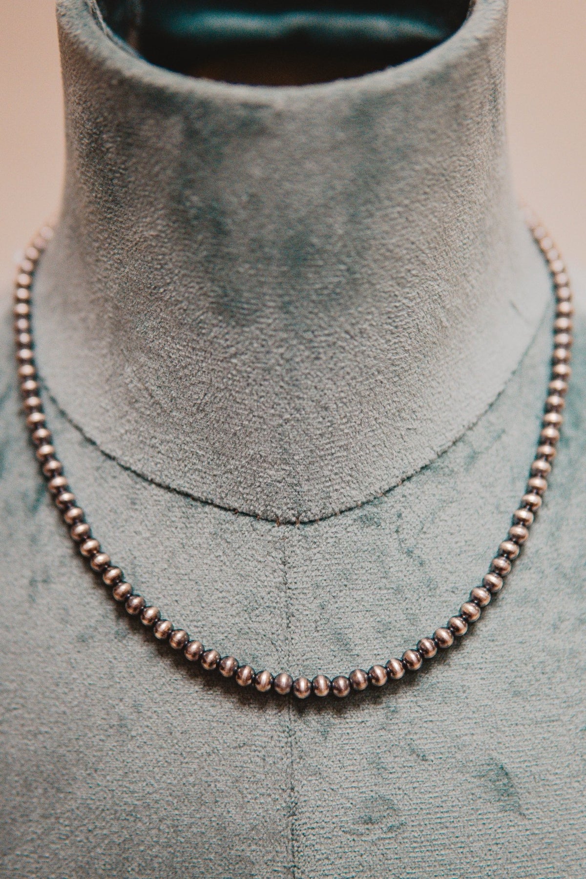 The perfect petite layer ✨ This 16" strand features delicate 4MM oxidized sterling silver Navajo pearls—simple, timeless, and easy to wear with everything. Whether you're layering it up or rocking it solo, this necklace adds just the right touch of Southwestern shine.