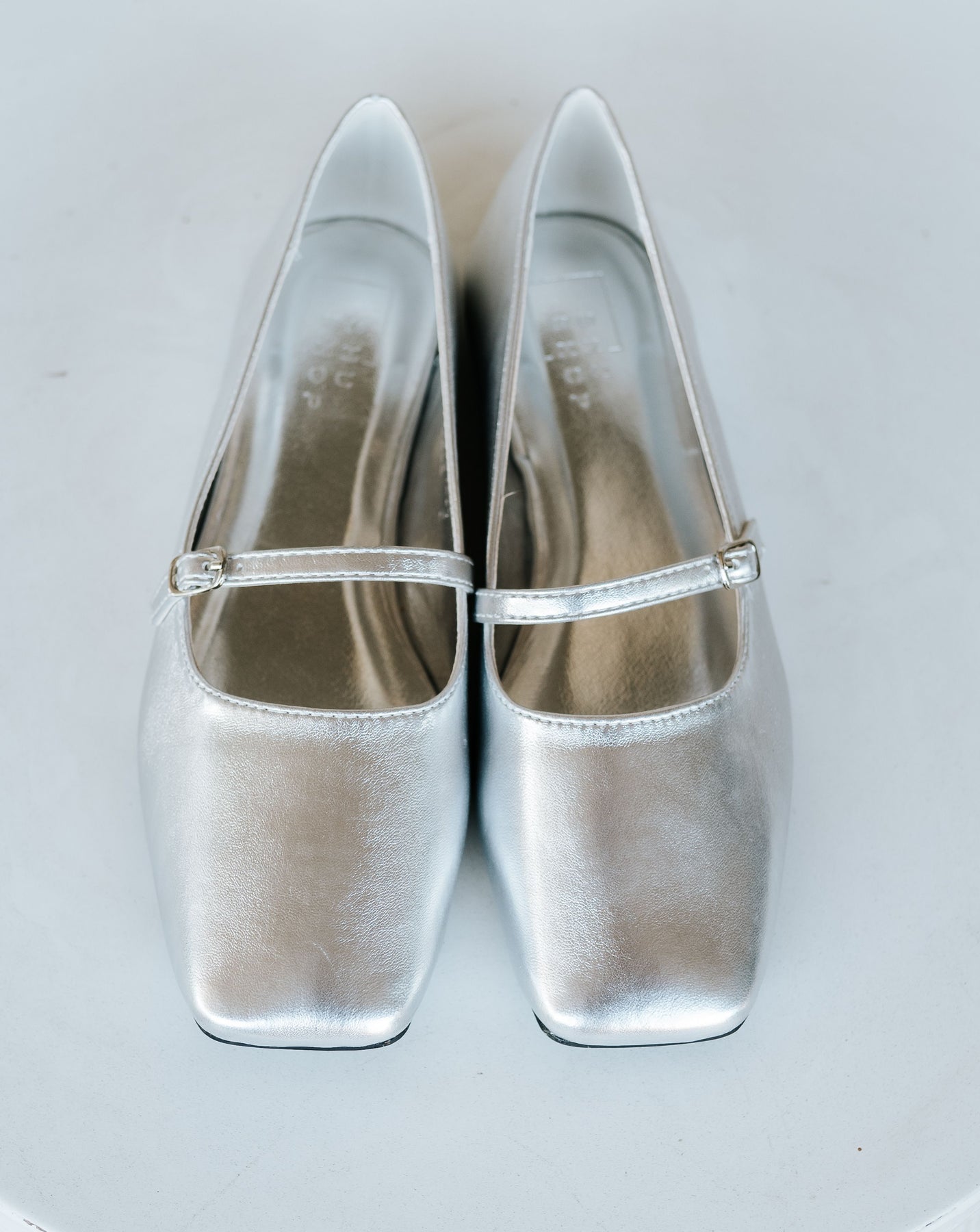 Shimmer and shine in the Adele Flat by Shu Shop, a modern Mary Jane silhouette with a sleek metallic finish. Designed with a square toe and slim strap, this sterling silver flat brings elegance and comfort to your everyday wardrobe. From office days to evenings out, it’s a versatile shoe that dresses up denim or pairs perfectly with dresses.