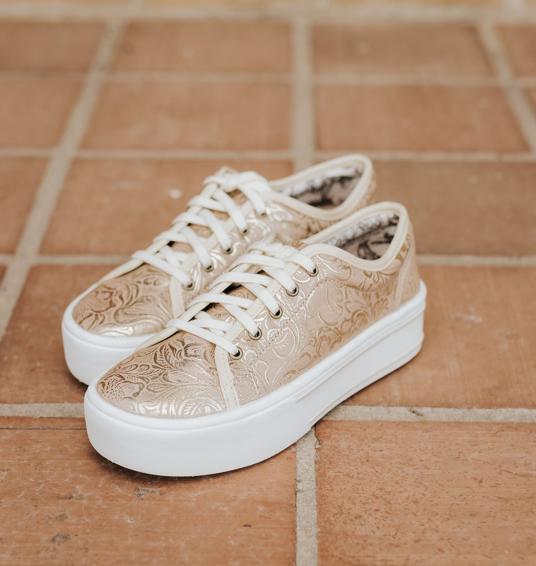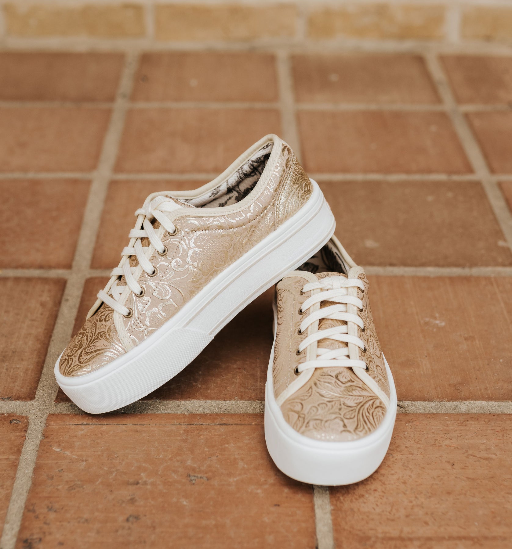 Laid-back comfort meets a touch of Western-inspired detail. The Skylar sneaker’s embossed floral leather brings subtle shine and personality to your casual look, while its cushy platform sole keeps you comfortable on the go. From running errands to weekend outings, this shoe is as versatile as it is stylish.